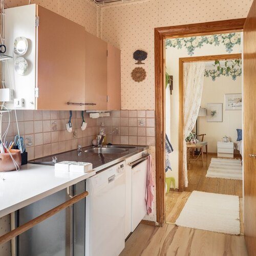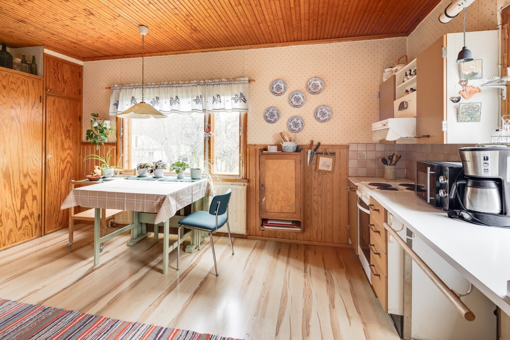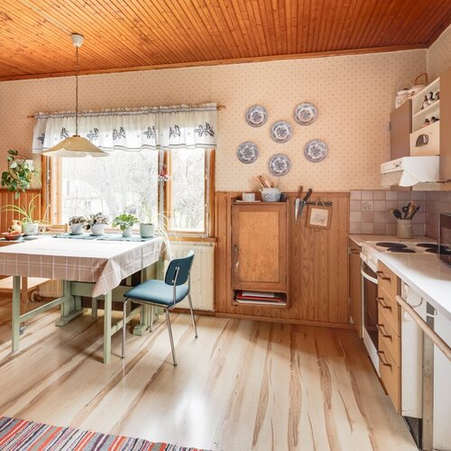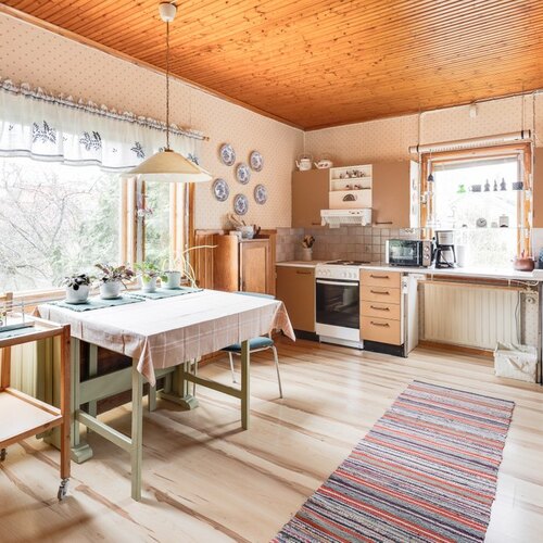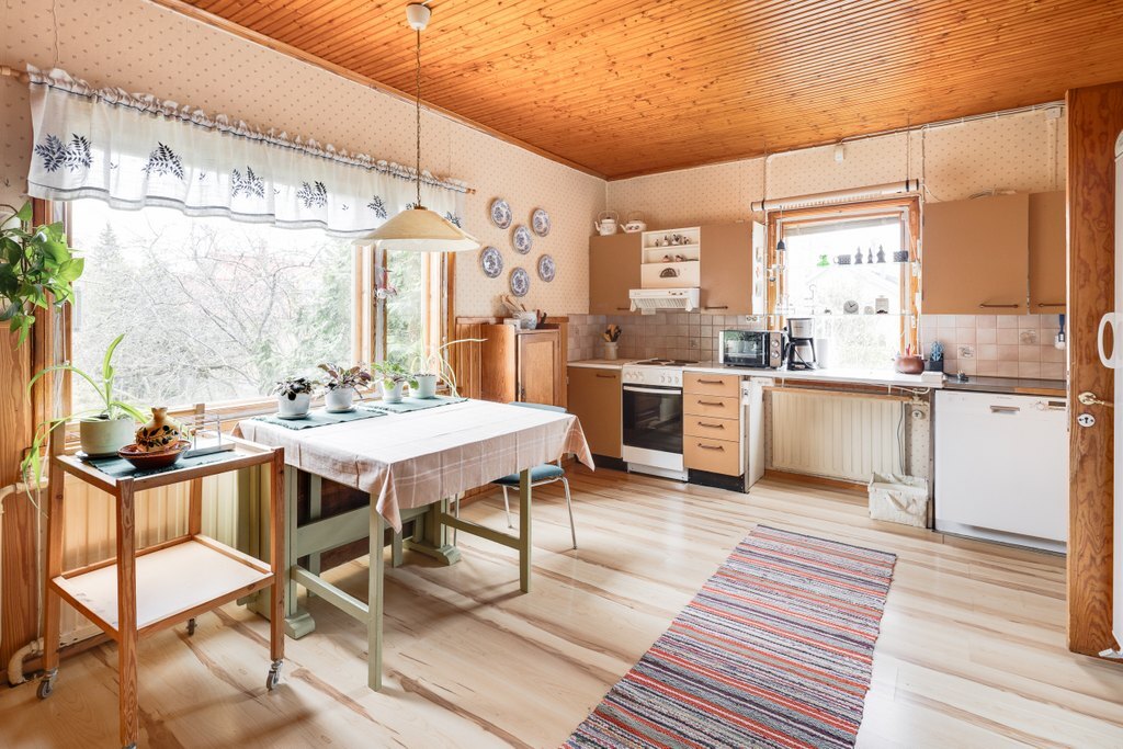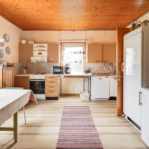 – Todella tilava keittiö, johon mahtuu isompikin ruokaryhmä ja kaappitilaa voi lisätä remontin yhteydessä.