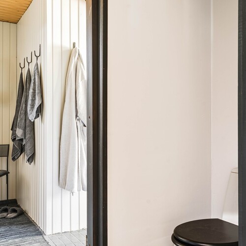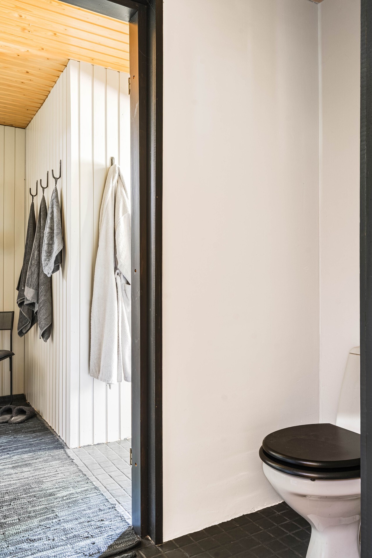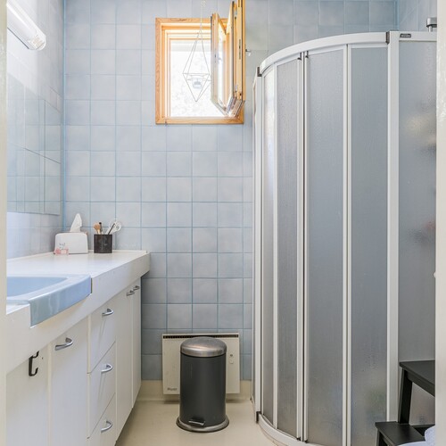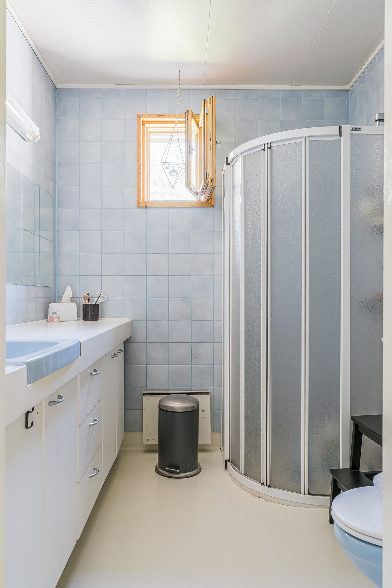 Lattia: muovi, seinät: kaakeli, Varustus: wc-istuin, suihkukaappi, bidee, suihku.