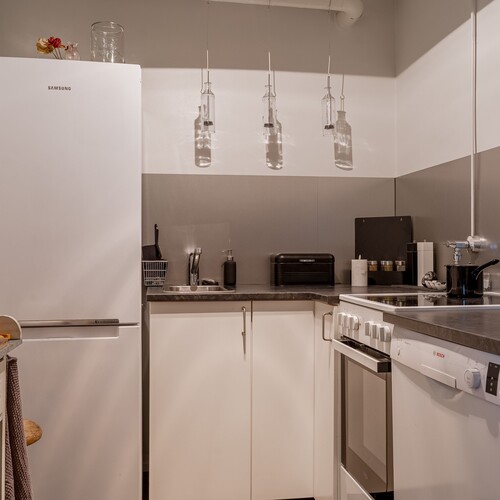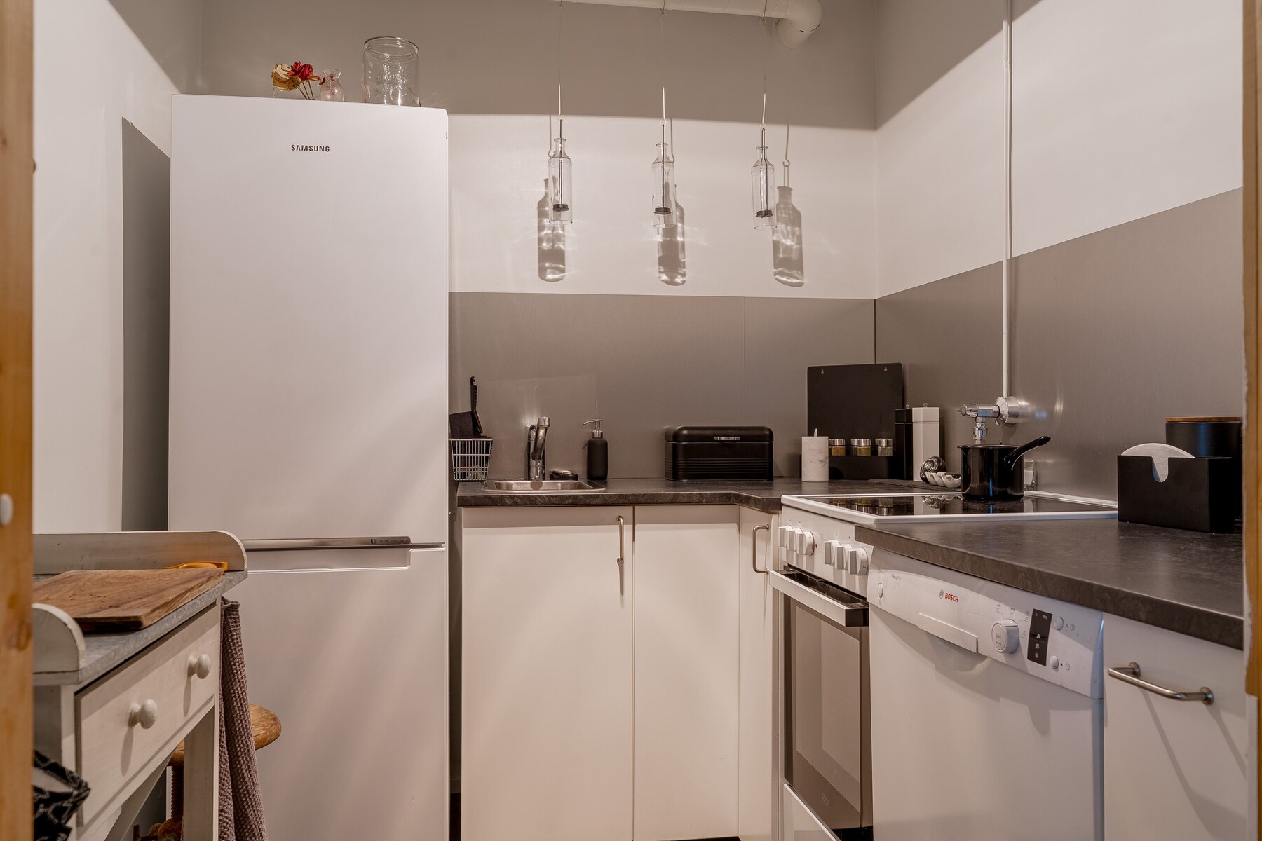 Alakerrassa on kodinhoitohuone muutettu keittiöksi.