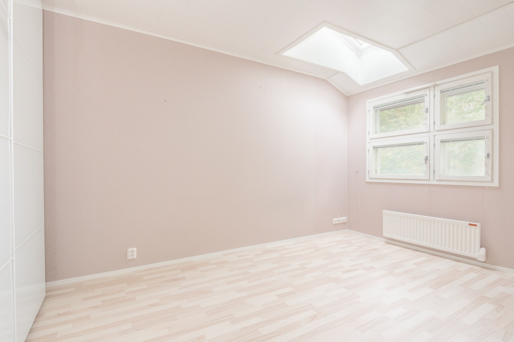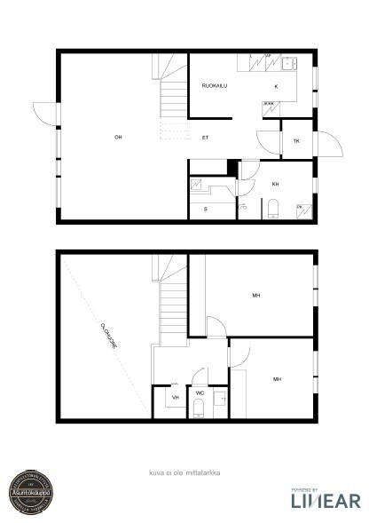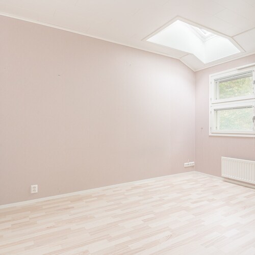 Yläkerrassa kaksi hyvän kokoista makuuhuonetta, vino katto ja kattoikkunat. Hyvät kaappitilat sekä vaatehuone aulassa.