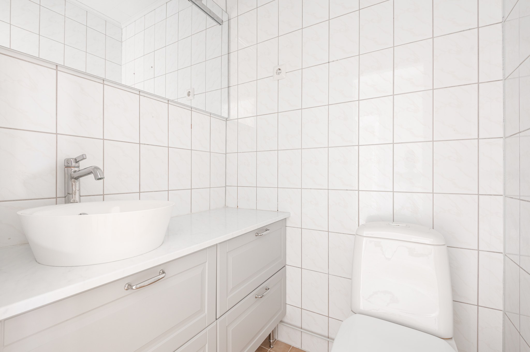 Varusteet: WC-istuin, lattialämmitys, peili, pesuallas, allaskaappi ja bidee-suihku