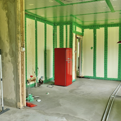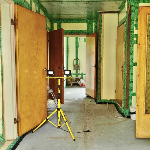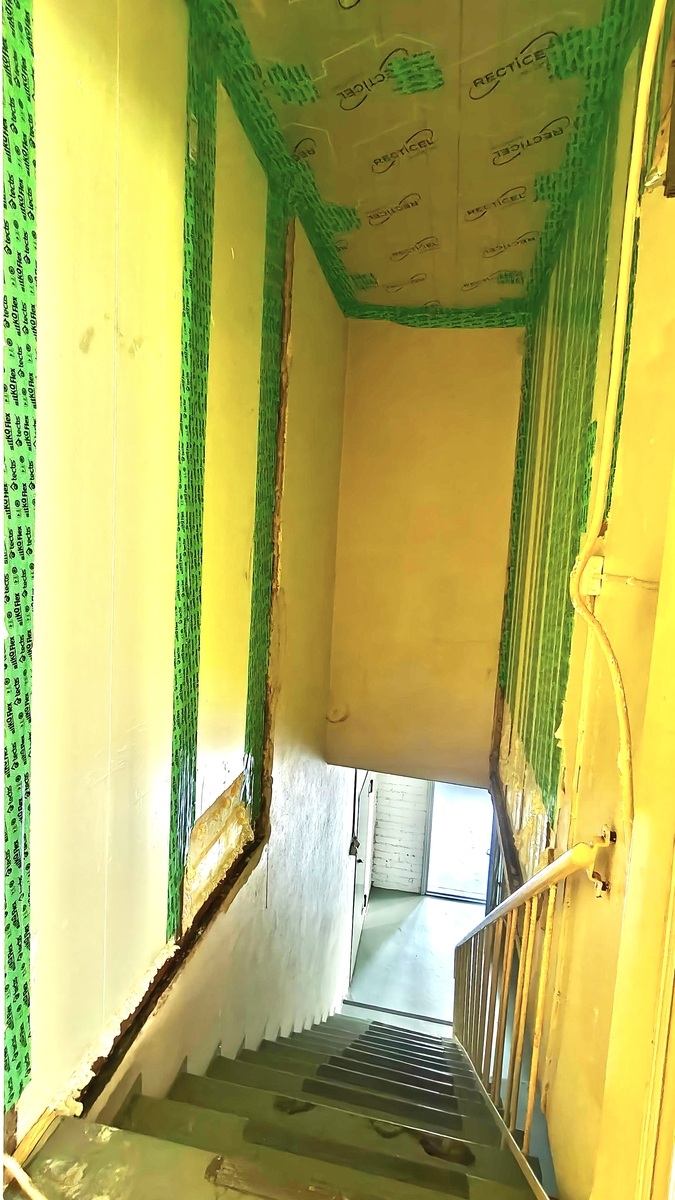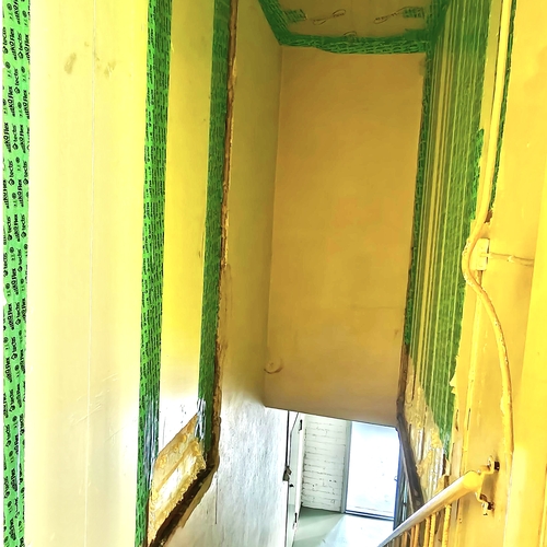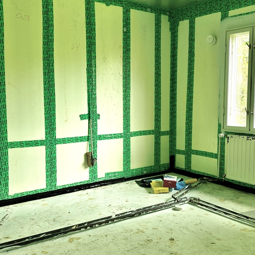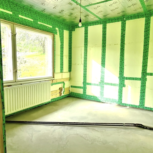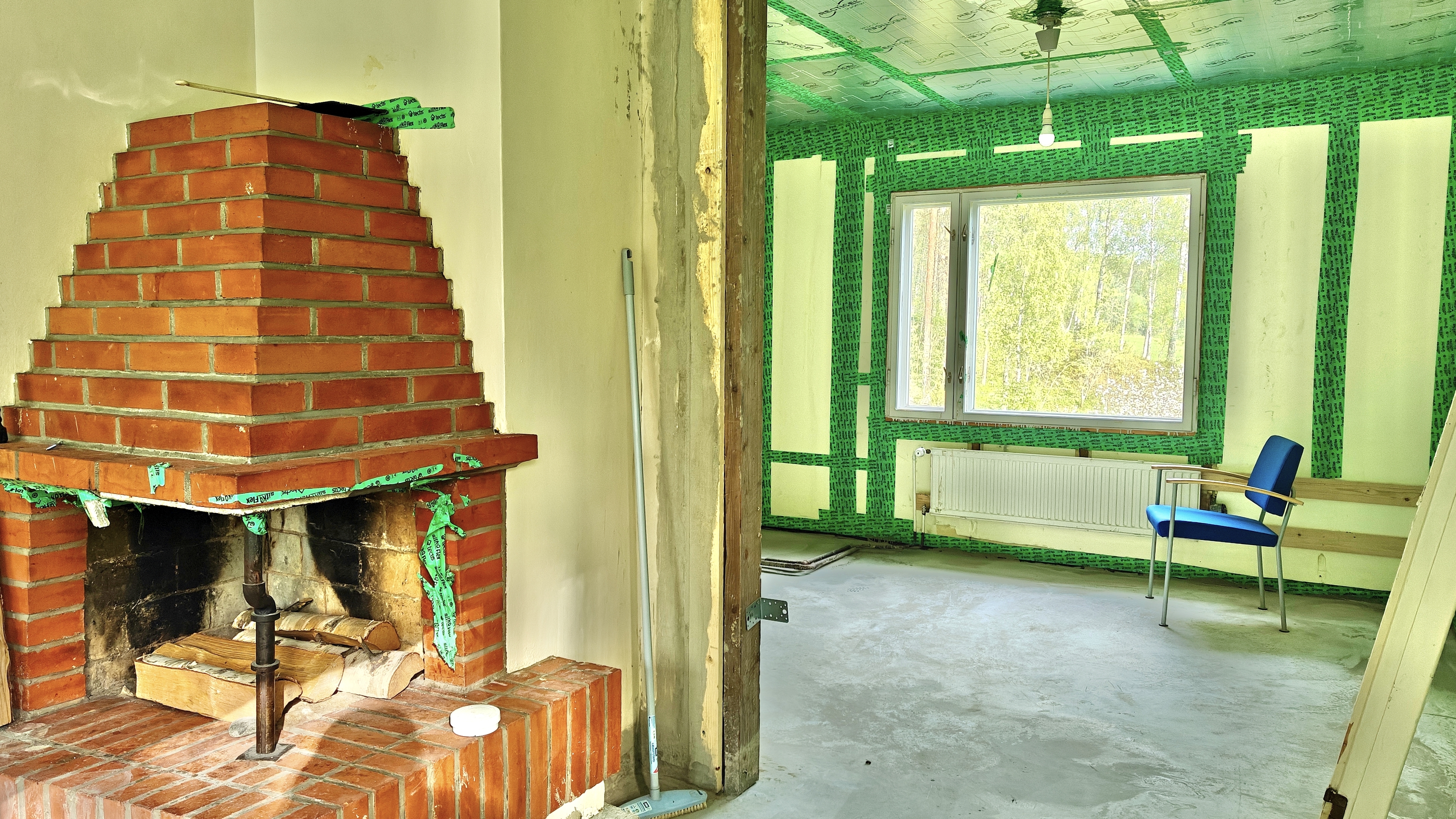 - Seinistä poistettiin kaikki vanha puurunkoon asti . Tiiliseinästä poistettiin laasti purseet että tiilen ja sisäseinän välissä kiertää ilma ja on riittävä tuuletus rako. Villa