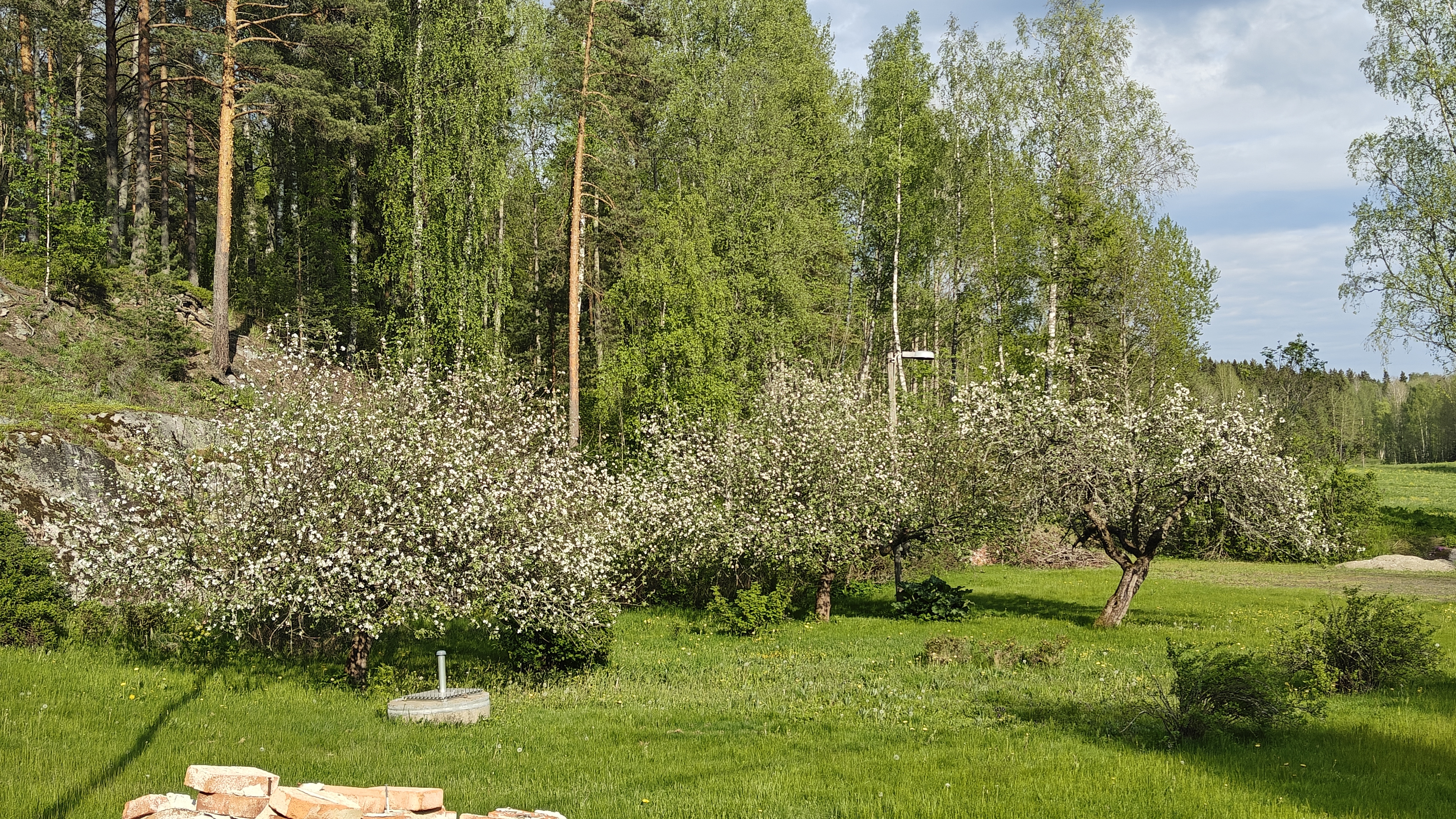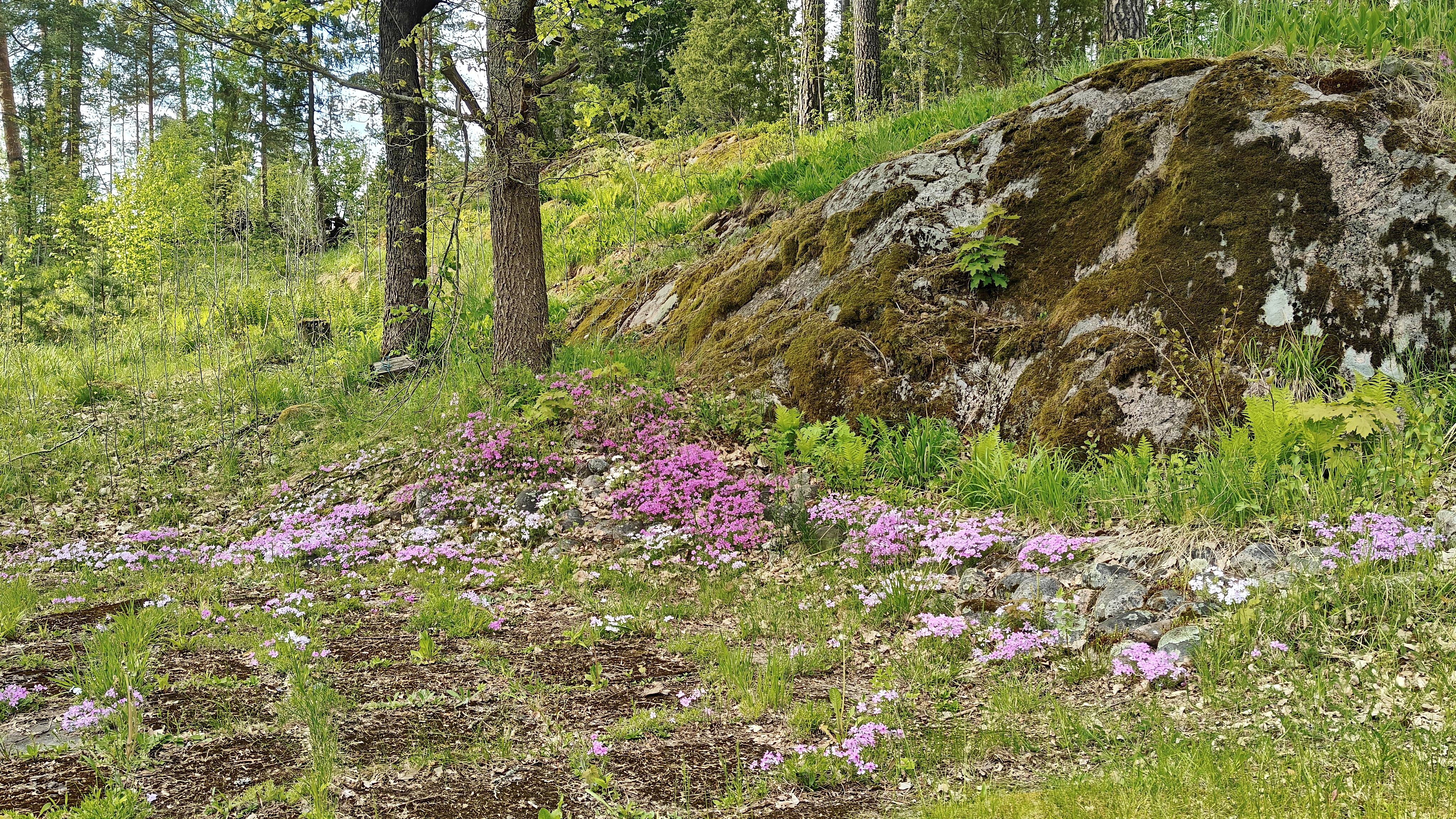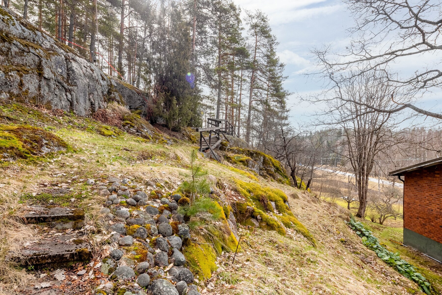 Tontti suurimmaksi osaksi tasamaata. Kaunis kallio talon takana.
