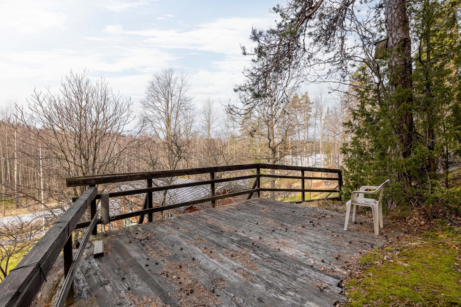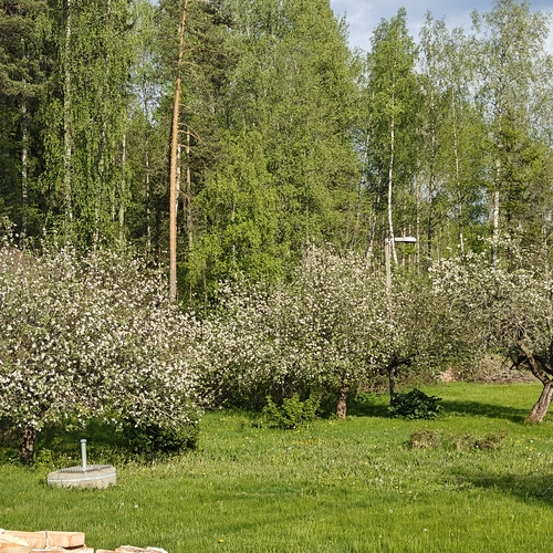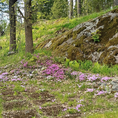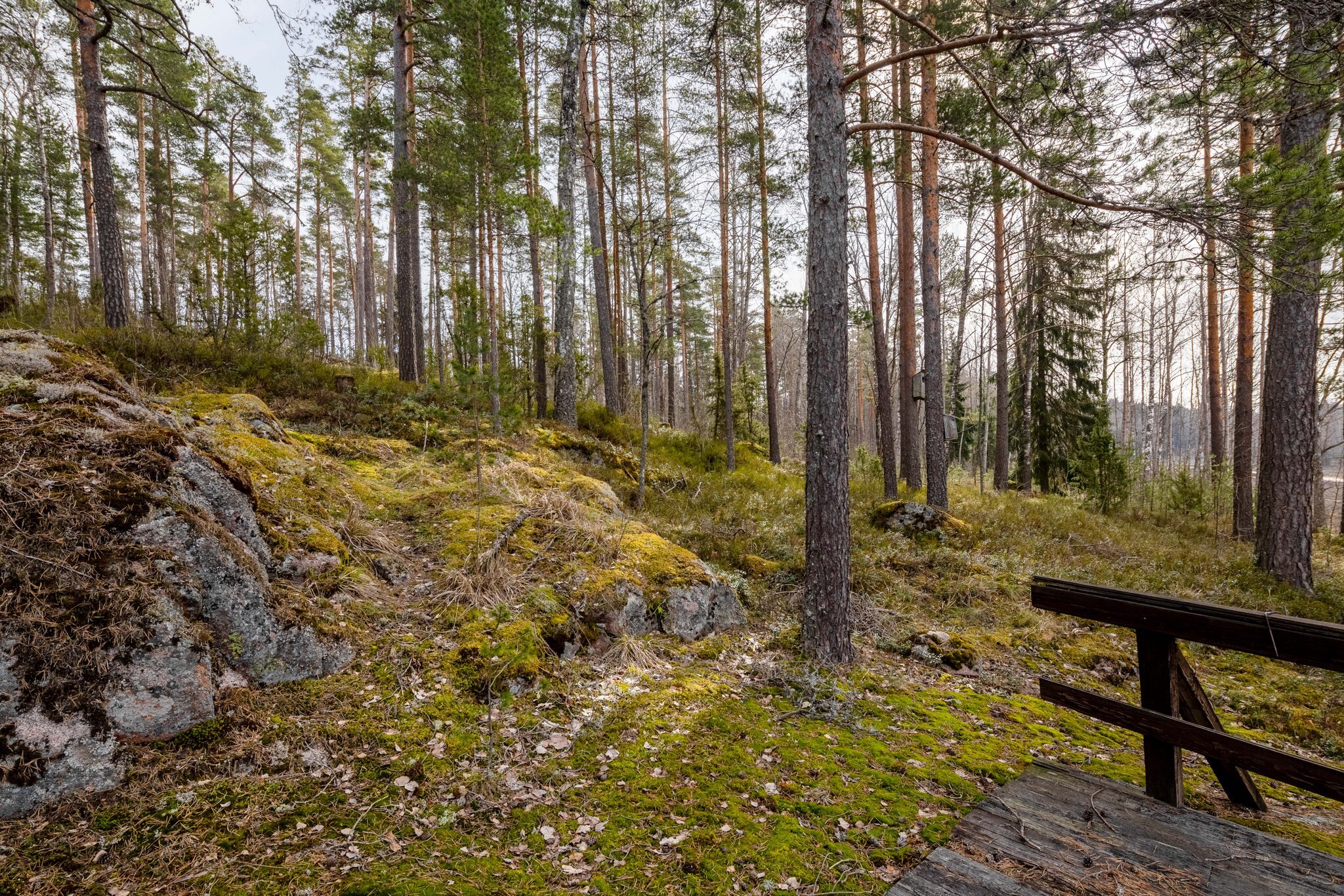 Tontti suurimmaksi osaksi tasamaata. Kaunis kallio talon takana.