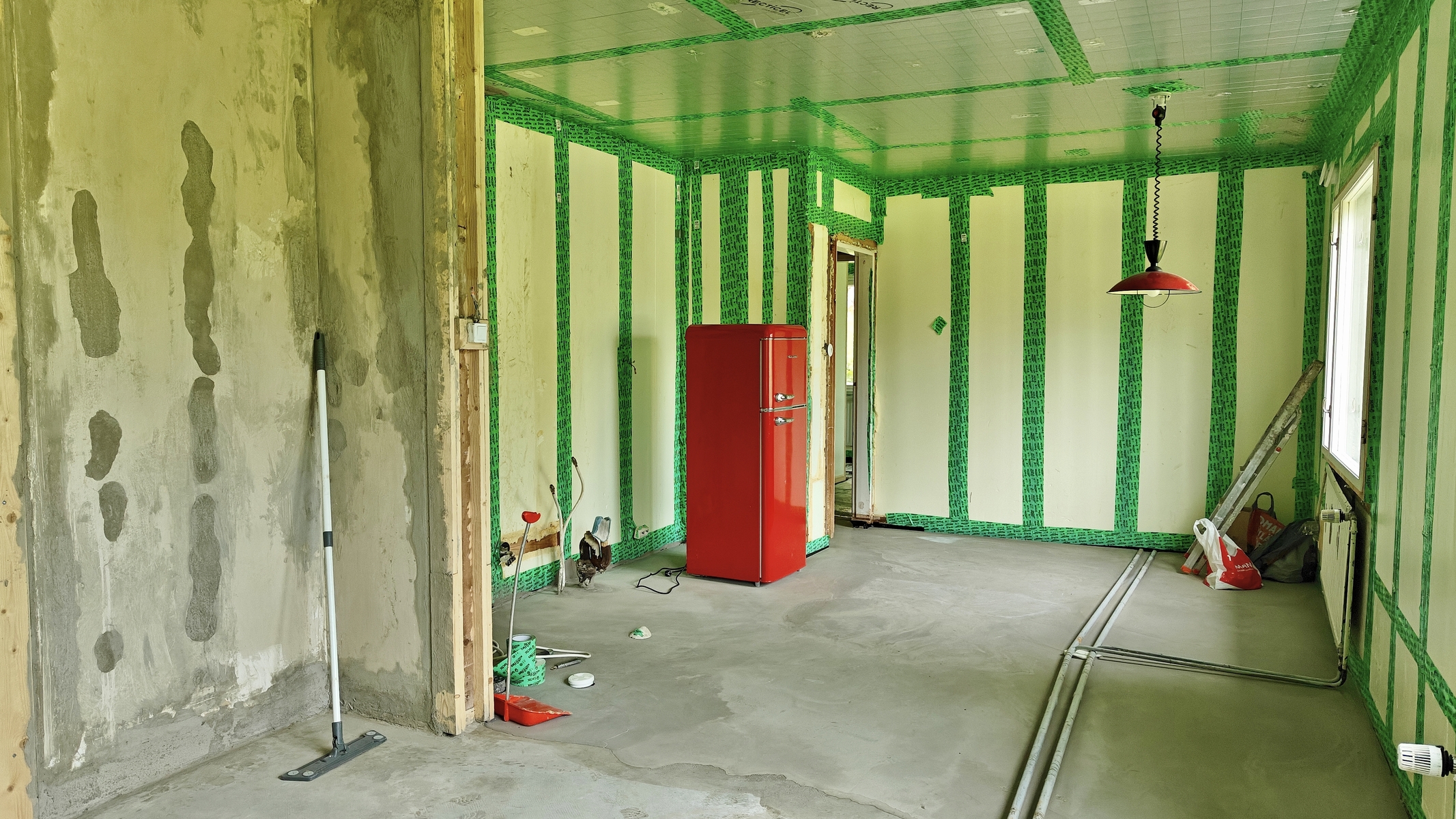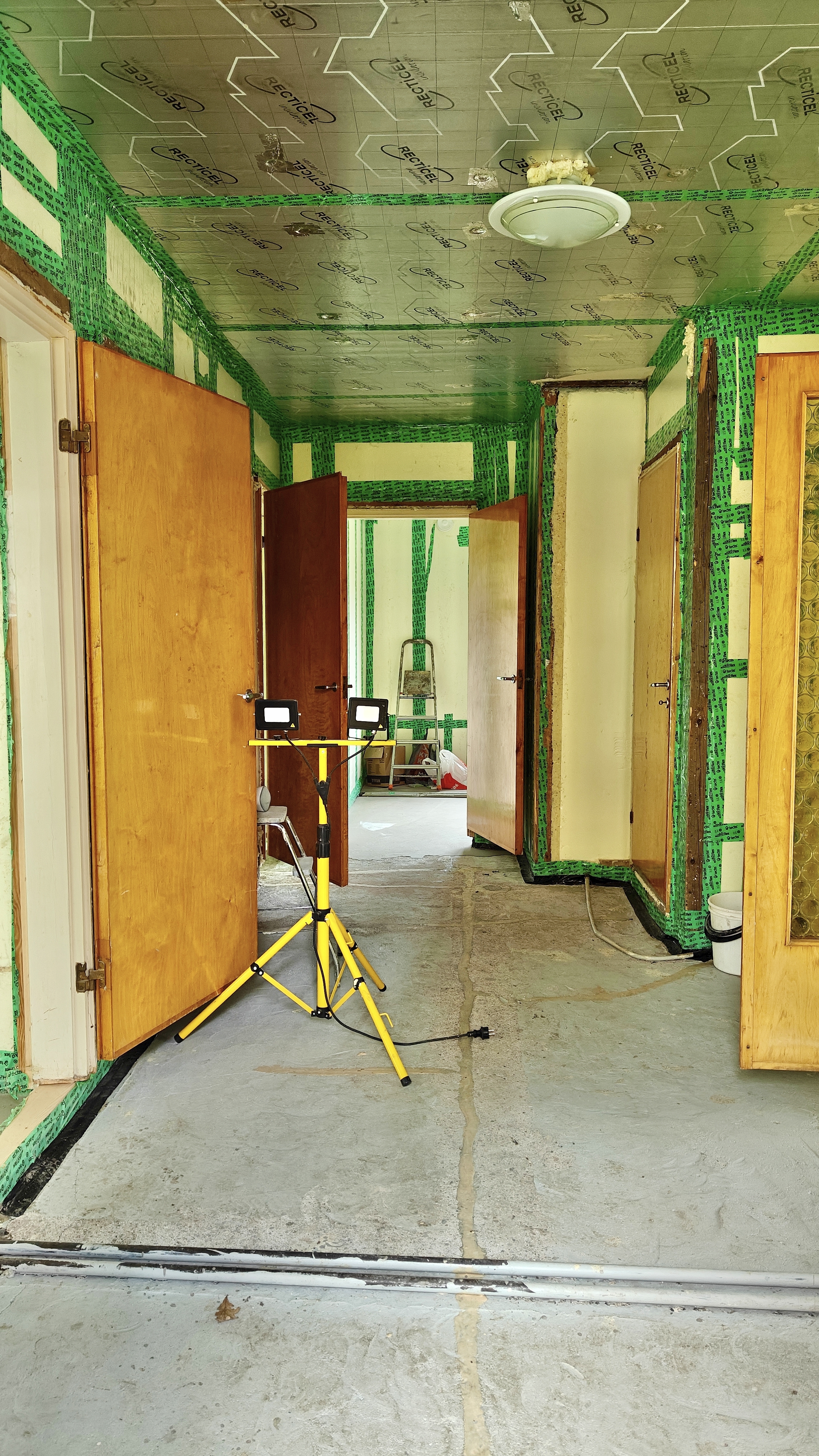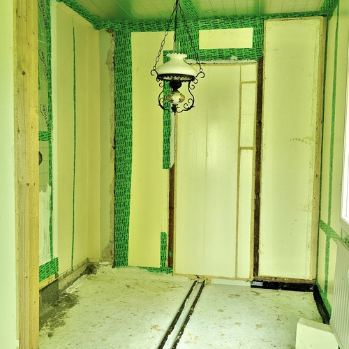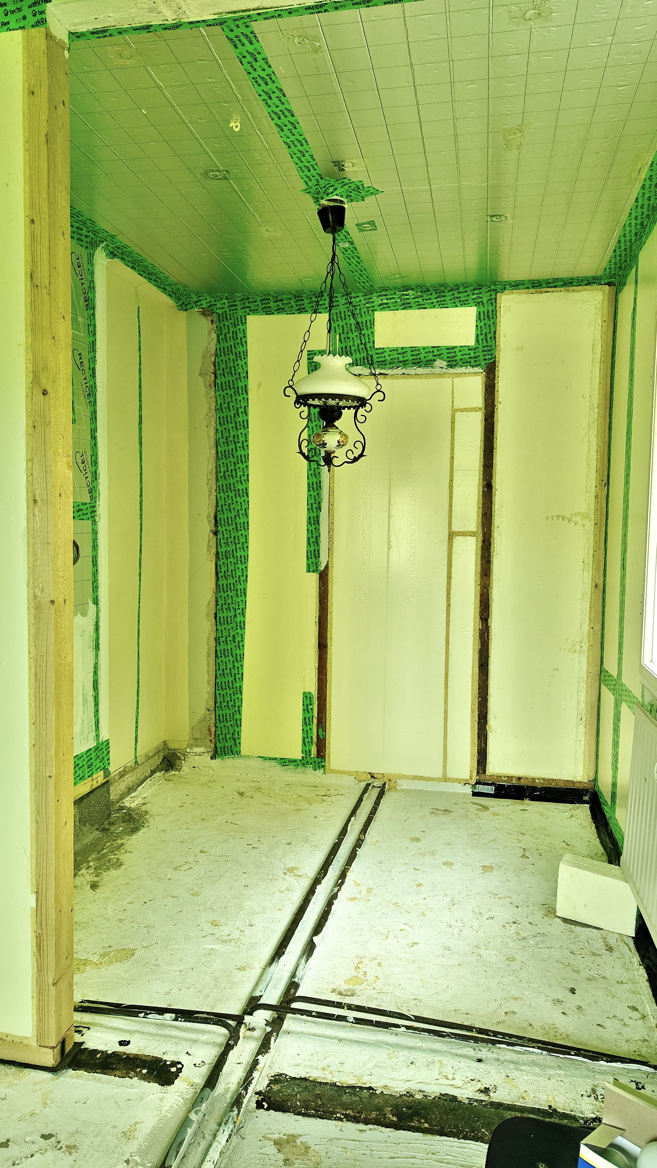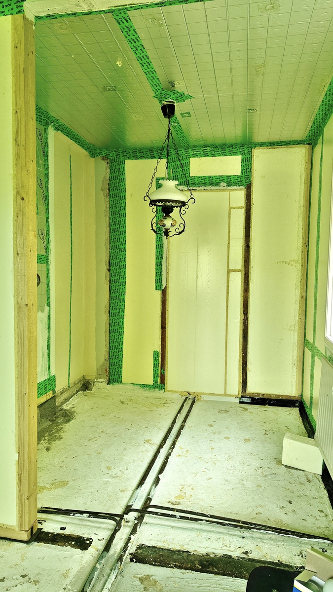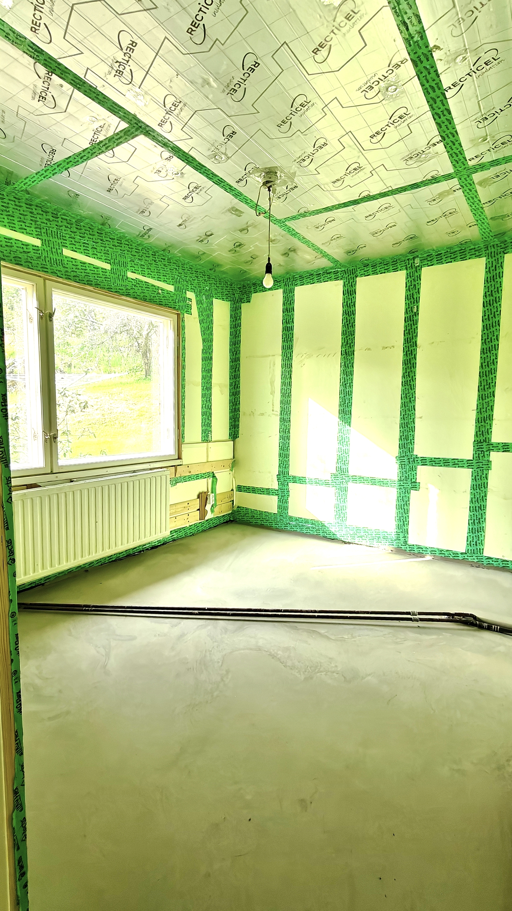 vanhat haltex pintalevyt ja kattoon asenettiin Recticelin 50 mm eristelevyt.