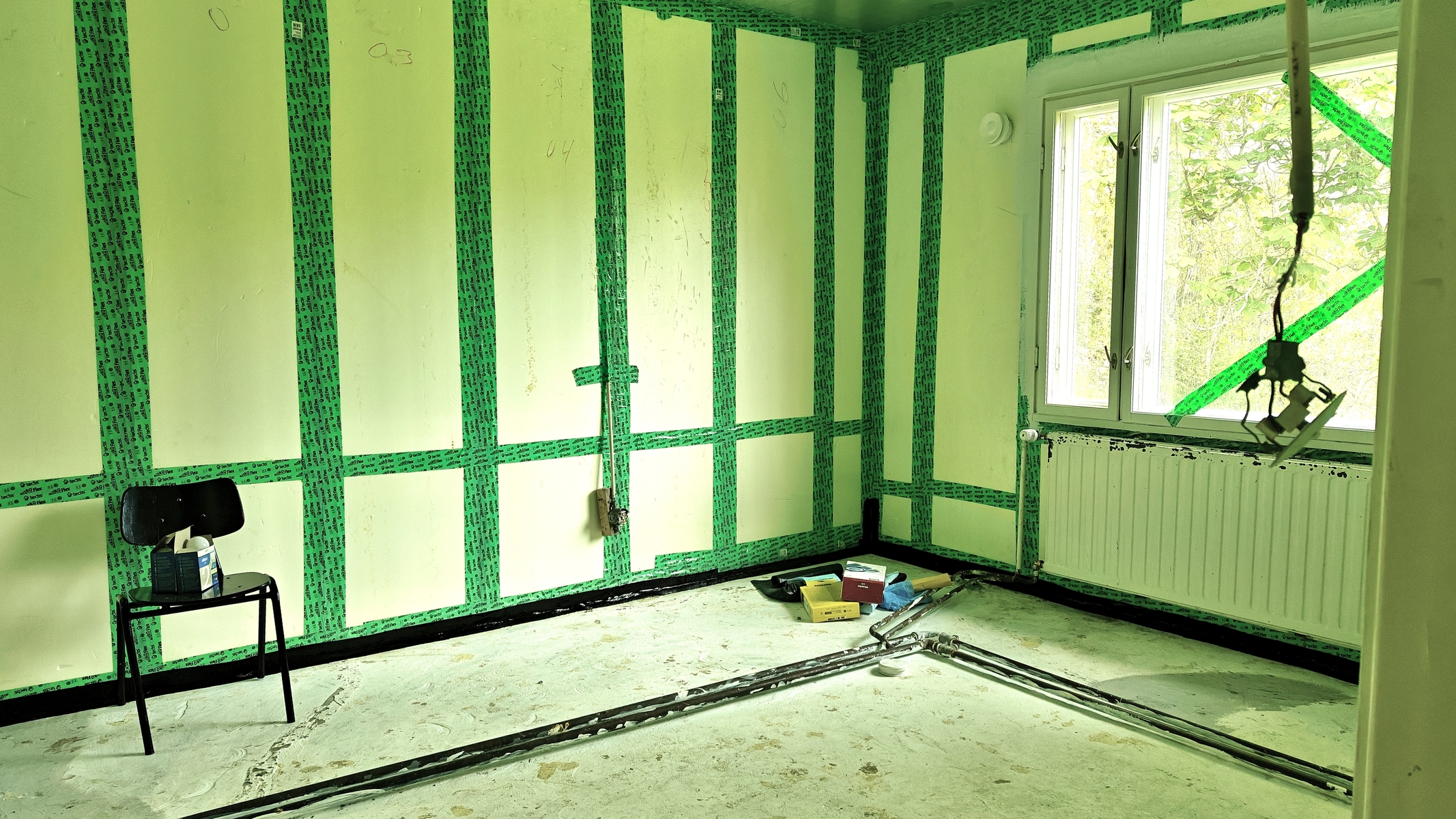 - Lattian pikisivelyt poistettu ja olohuoneen, ruokailutilan, keittiön ja pienen makuuhuoneen lattiat tasoitettiin Weberin 4100 tasoitteella. - Yläkerran katosta poistettiin