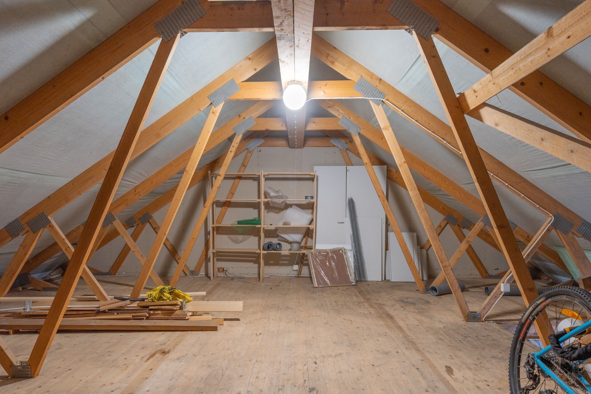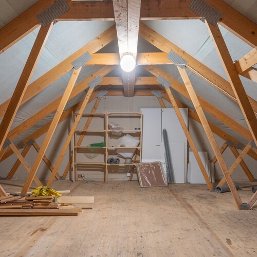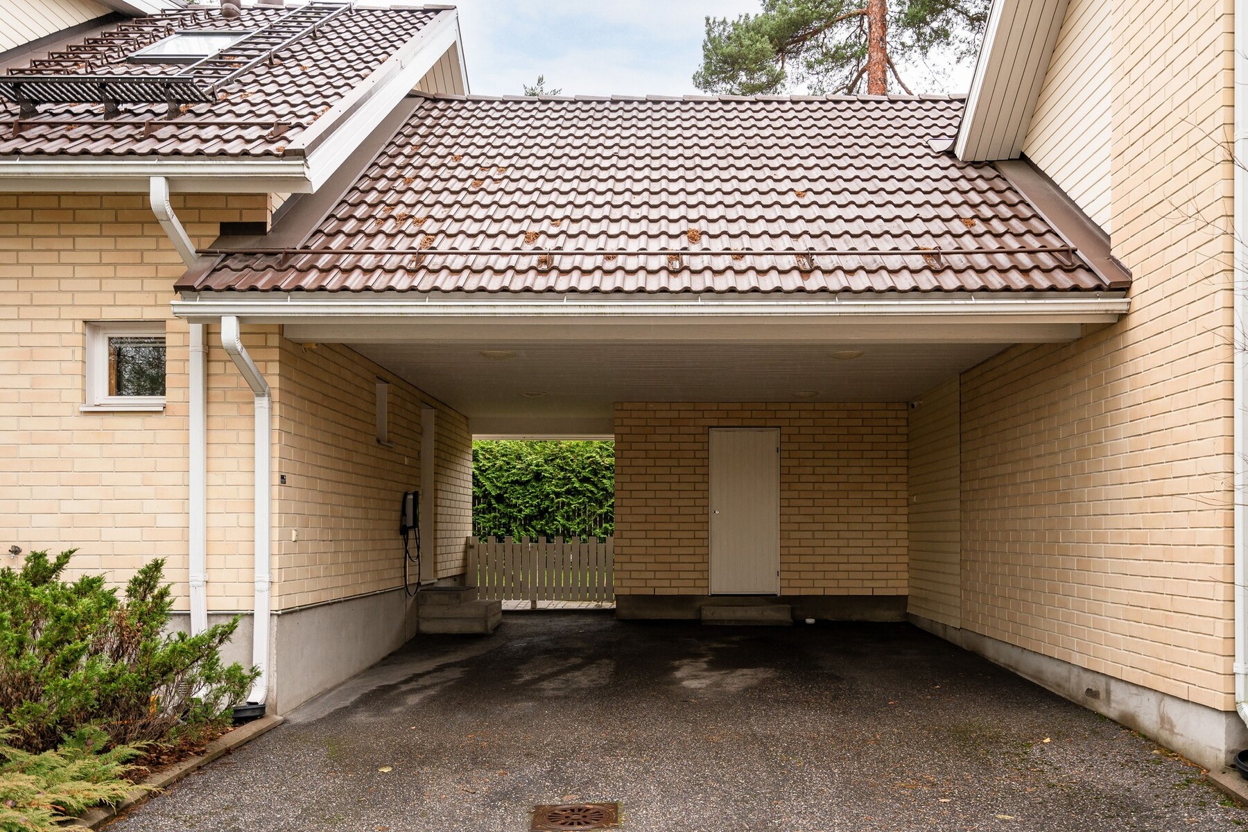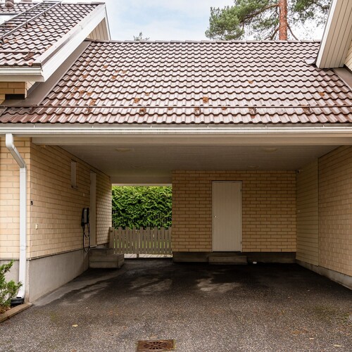– Ulkovaraston päällä on koko autokatoksen kokoinen n. 15 m² kylmä ullakko varastotilana.