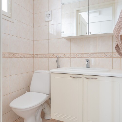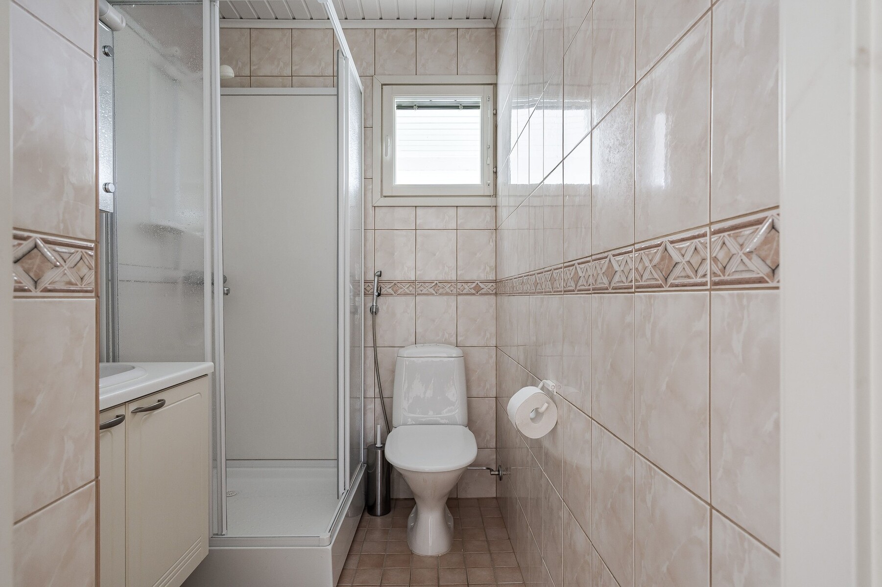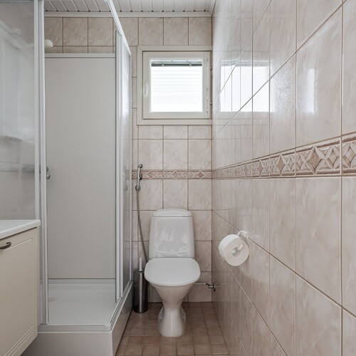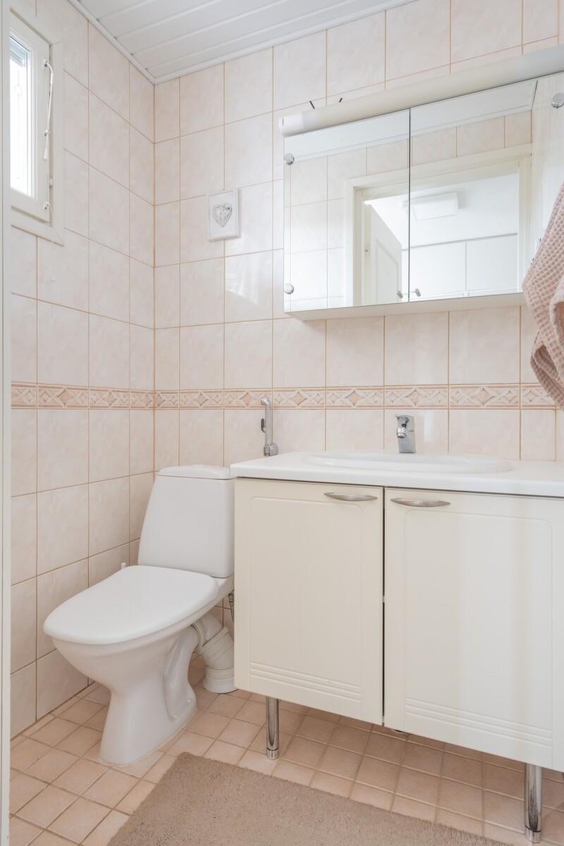 Yläkerran kylpyhuone, WC-istuin, suihkukaappi, peili- ja allaskaappi, ikkuna ulos.