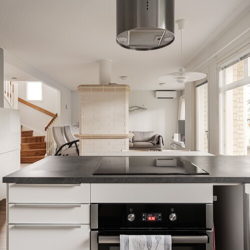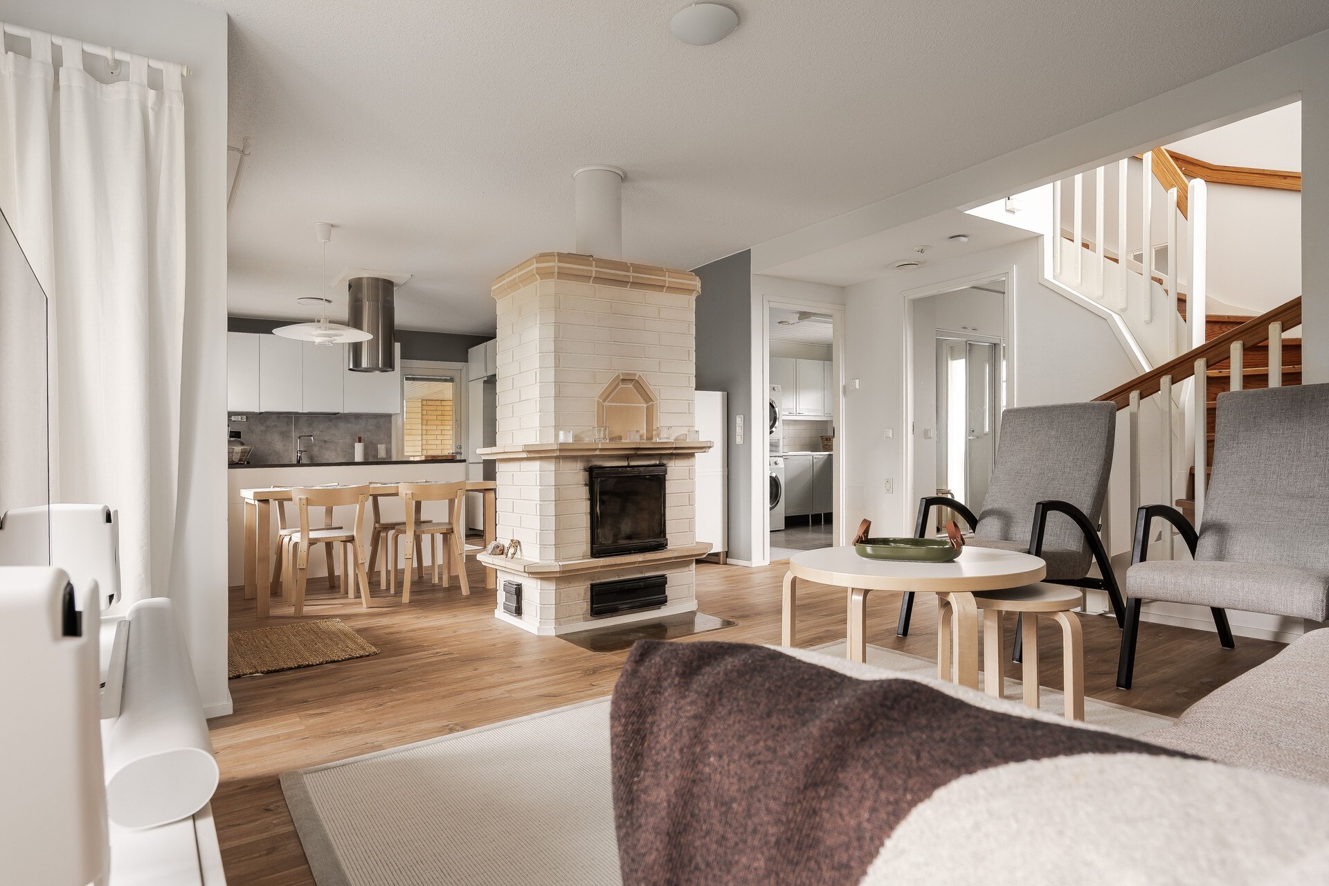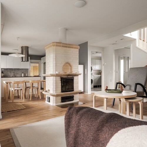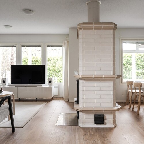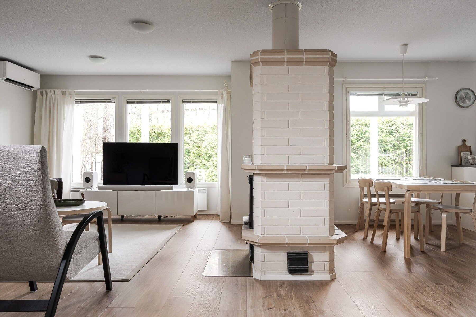 – Alakerrassa keskeisellä paikalla lämmittää varaava takka ja asunnossa myös kaksi ilmalämpöpumppua.