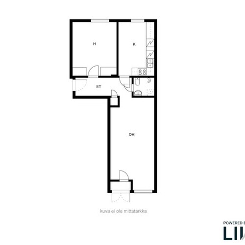 Asuinpinta-alaa ei ole mitattu. Ei tarkistusmitattu. Pinta-alat saattavat tämän ikäisissä kohteissa (yhtiö rekisteröity ennen 1.1.1992) poiketa olennaisestikin asuinrakennusten nykyisten mittaustapojen ja standardien (SFS 5139) mukaan laskettavasta asuintilojen pinta-alasta. Pinta-ala voi siis olla edellä mainittua pienempi tai suurempi.