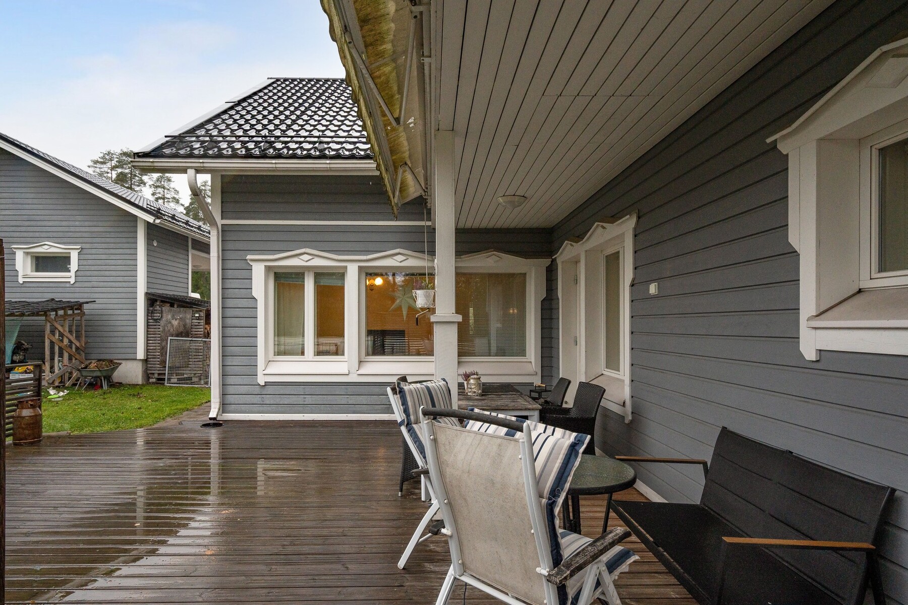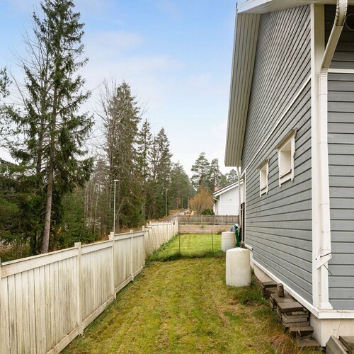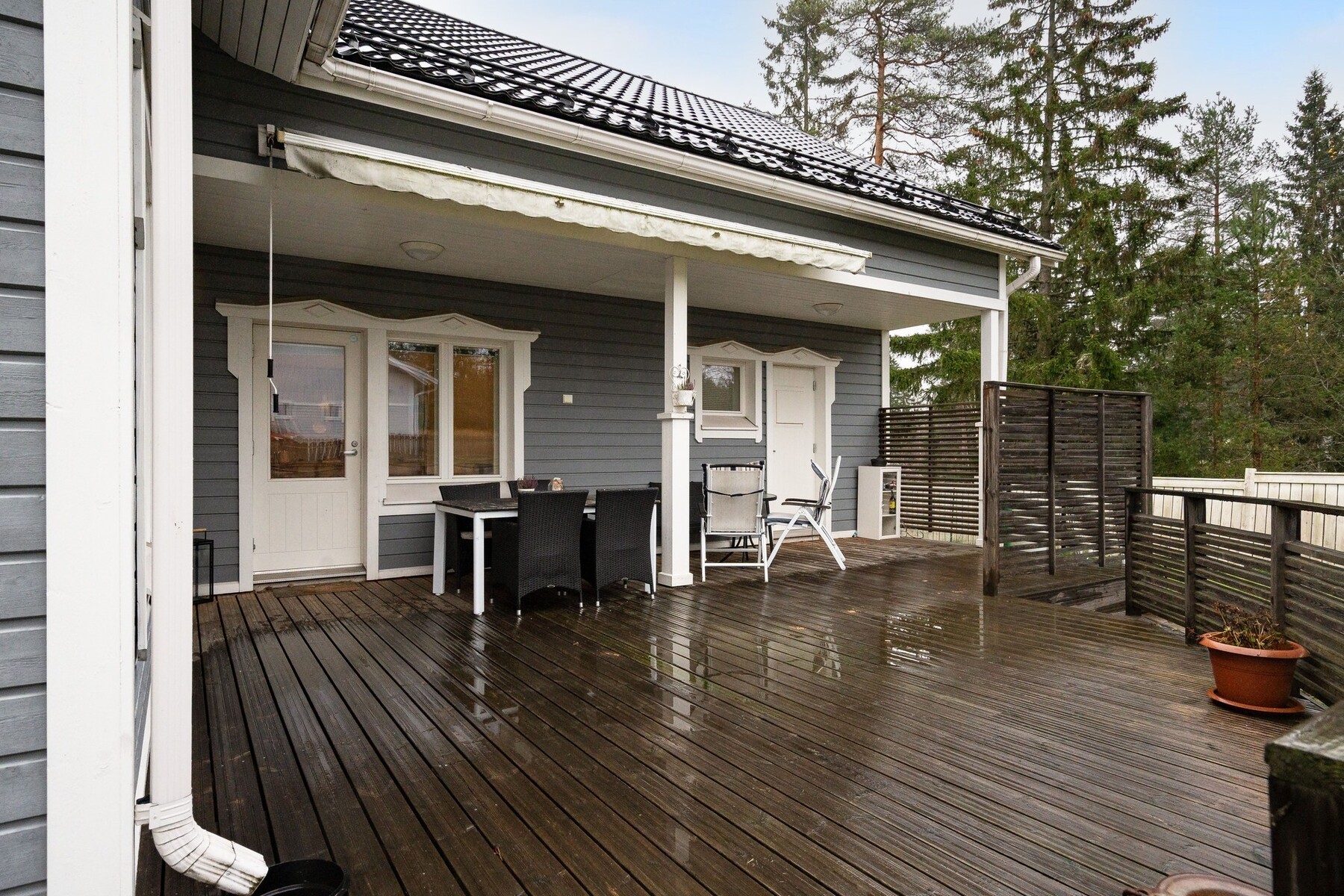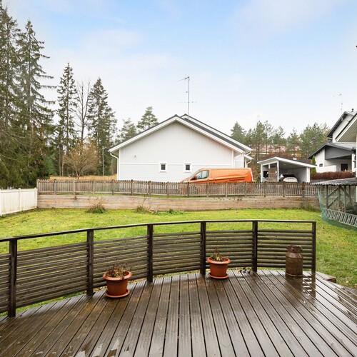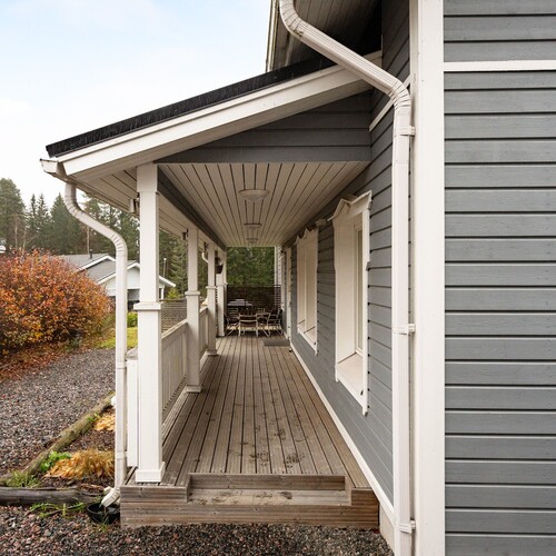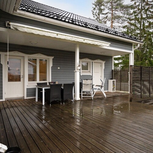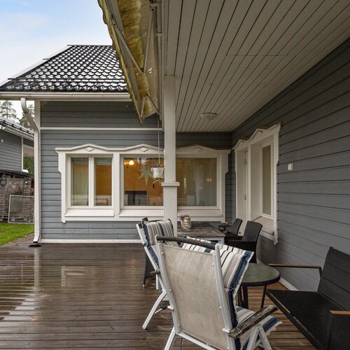 Pääsisäänkäynnin yhteydessä katettu terassi. Takapihan puolella aurinkoinen terassi, johon käynti olohuoneen jatkeena olevasta vierashuoneesta sekä kodinhoitohuoneesta. Markiisi.