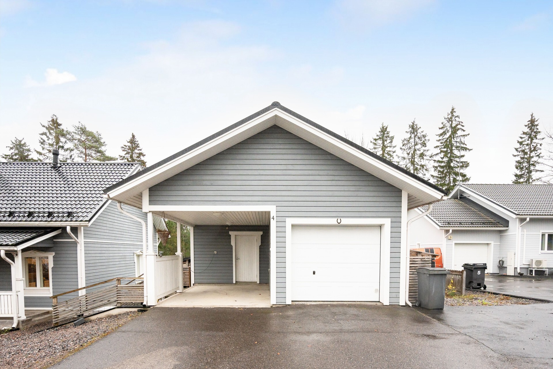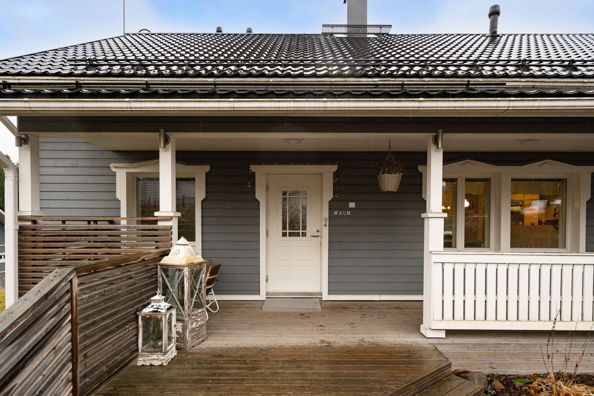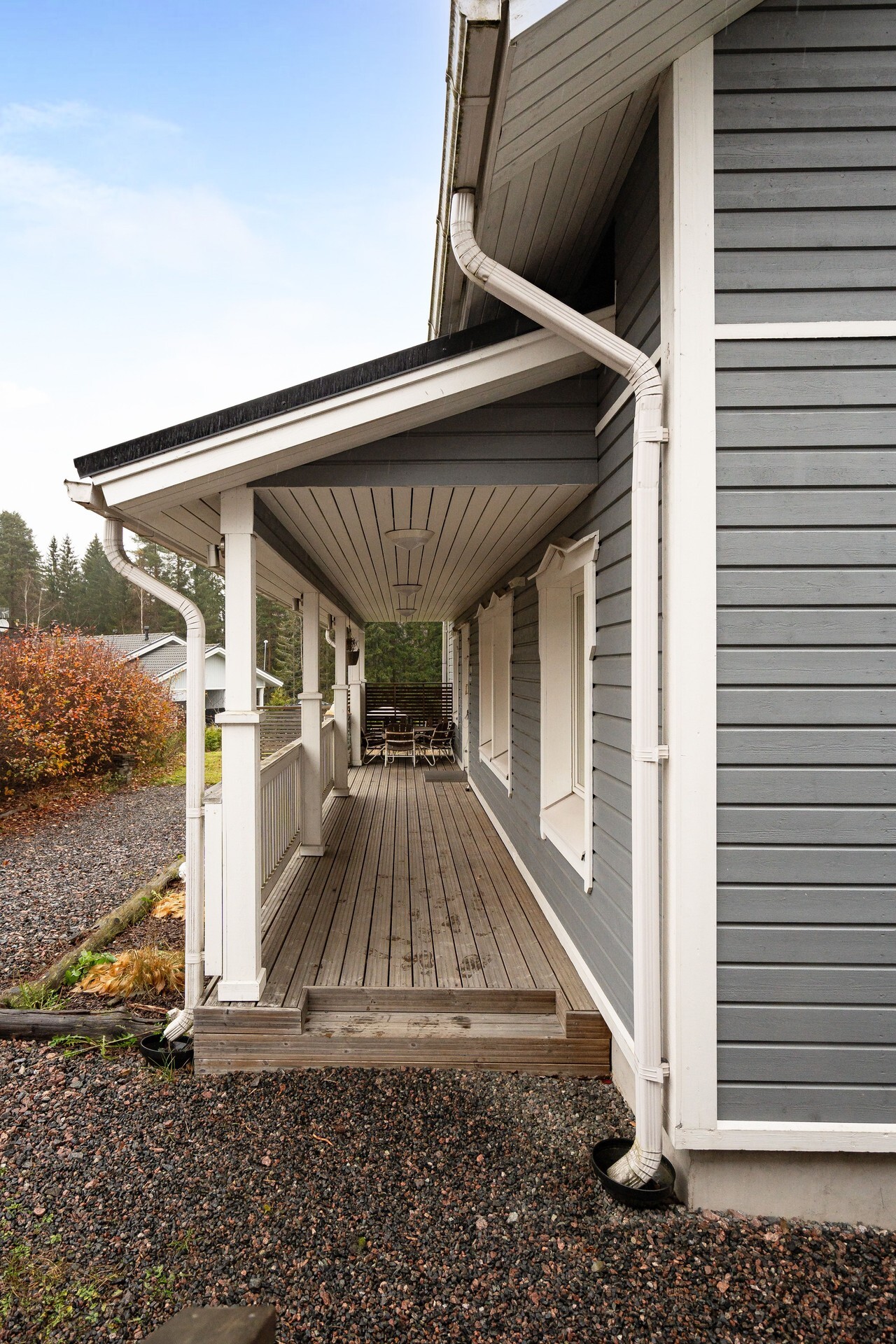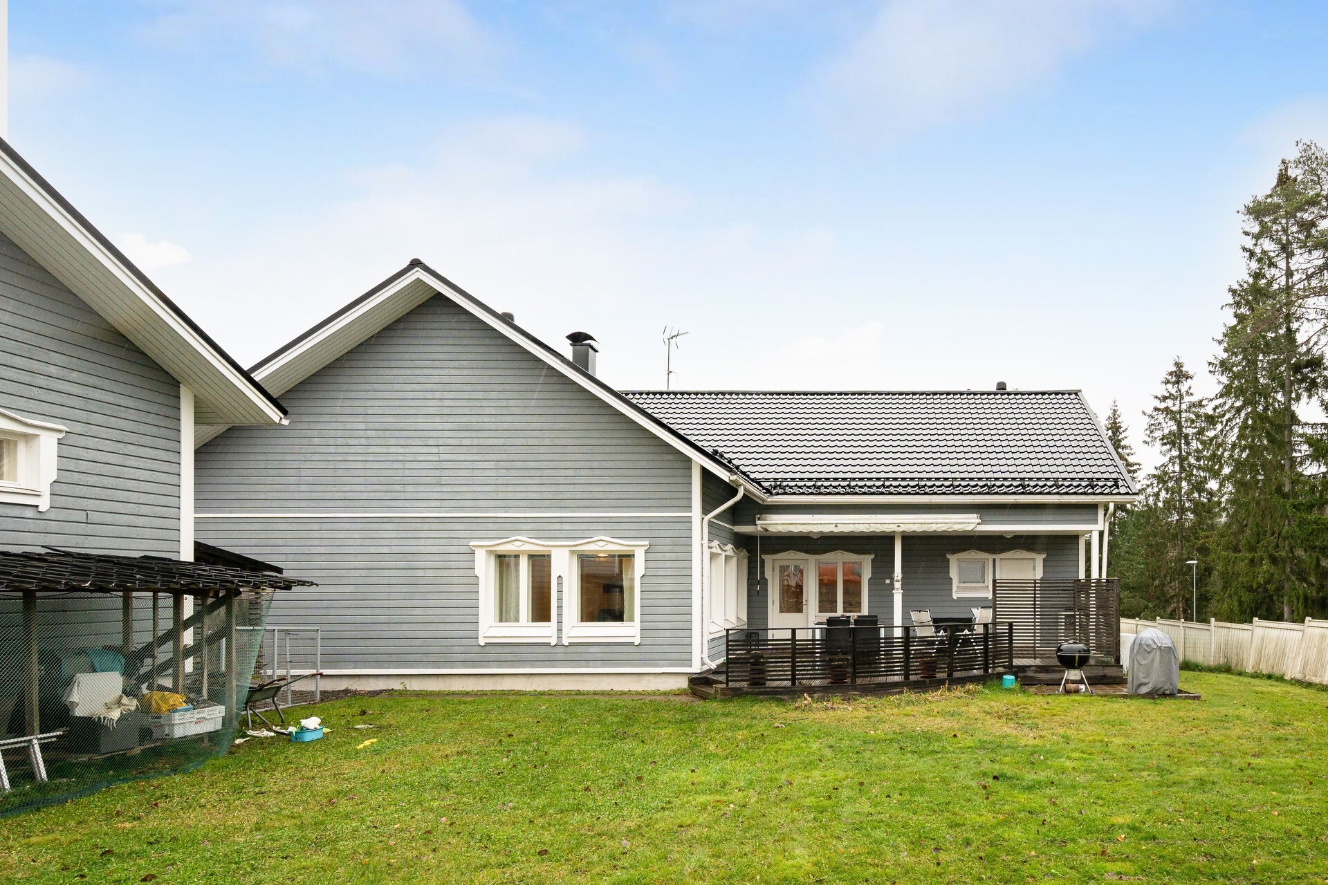 Pääsisäänkäynnin yhteydessä katettu terassi. Takapihan puolella aurinkoinen terassi, johon käynti olohuoneen jatkeena olevasta vierashuoneesta sekä kodinhoitohuoneesta. Markiisi.