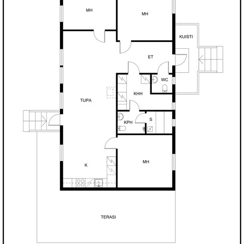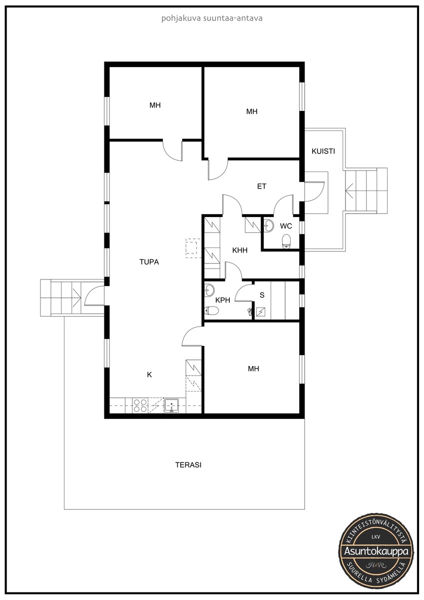 Etuterassi etelän suuntaan, takaterassi pohjoisen puolella.