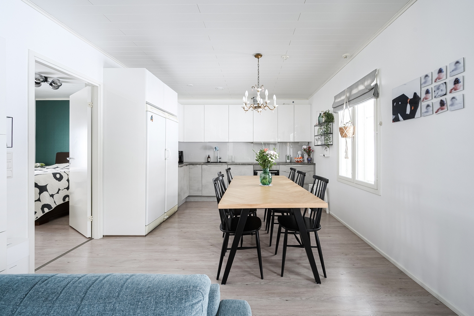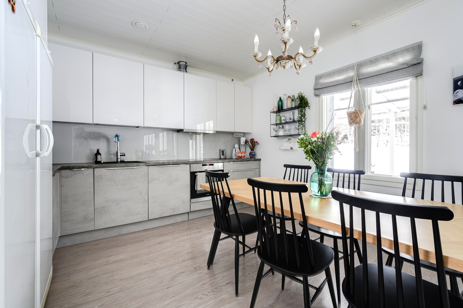 – Lähes 40 m² tupakeittiössä mahtuu hyvin ruokailemaan ja oleskelemaan.