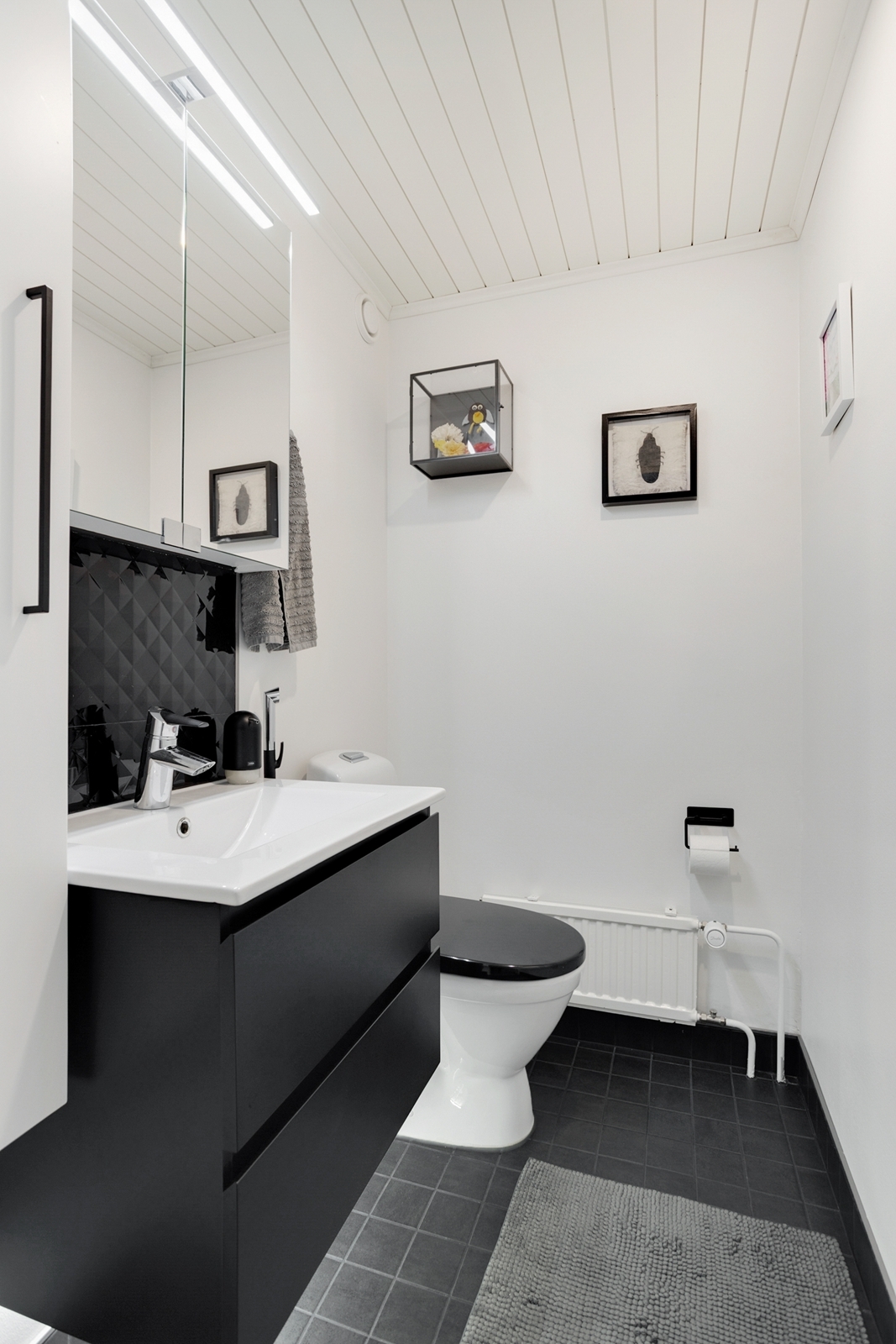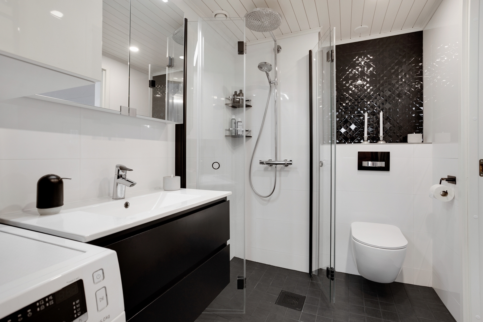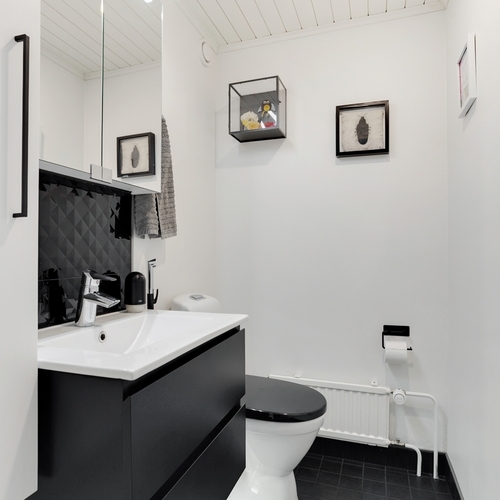 Varusteet: lattiaan asennettu WC, bidee, peilikaappi, allaskaappi