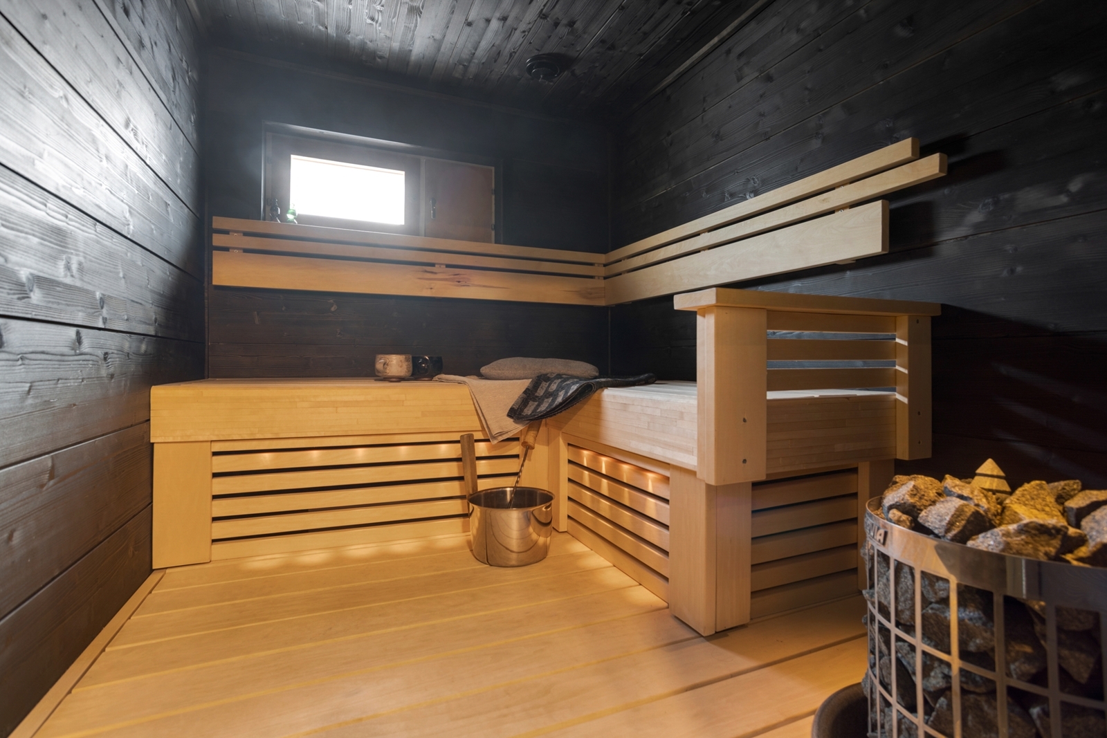 Saunassa seinät paneelia, ikkuna ulos.