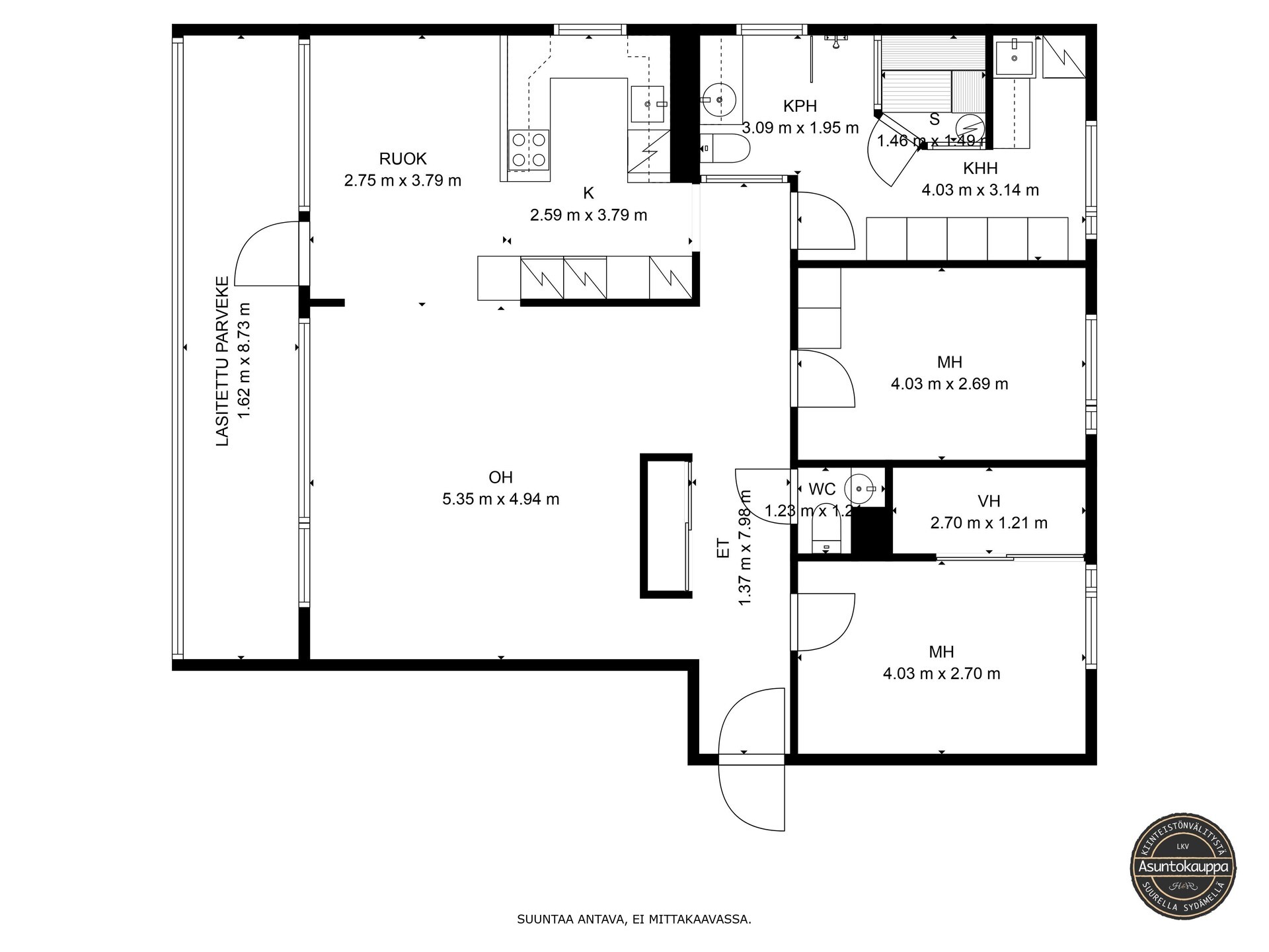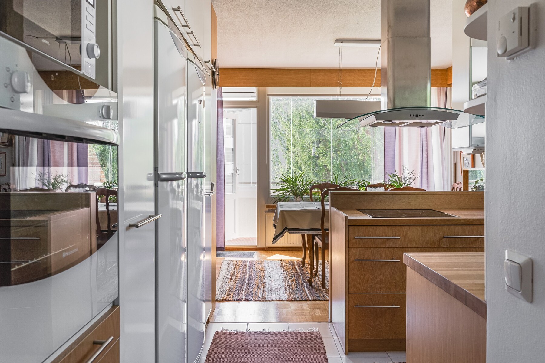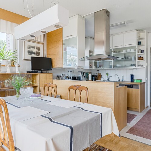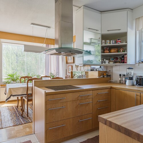 Varusteet: jääkaappi, pakastin, astianpesukone, keraaminen liesi, erillisuuni, liesituuletin