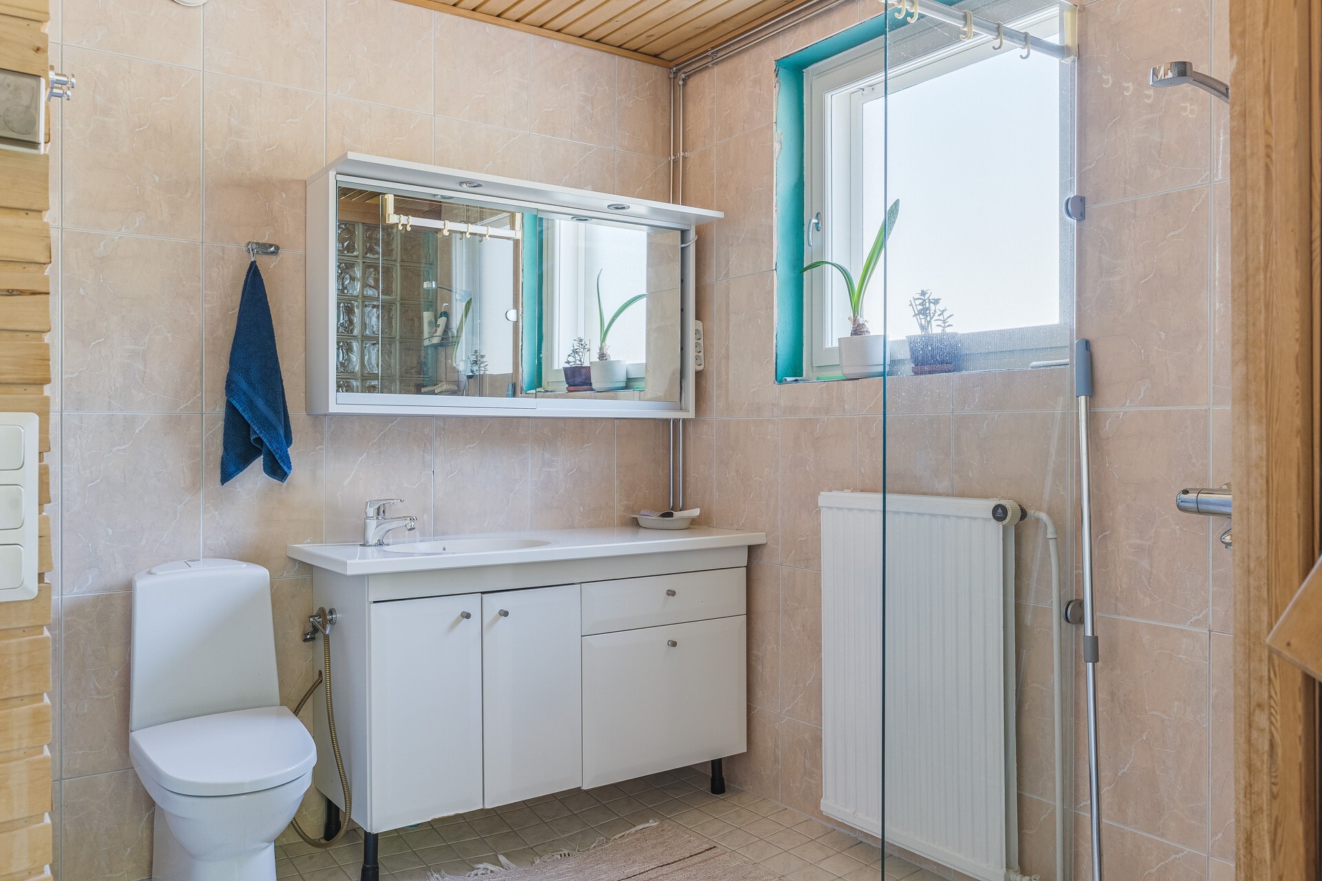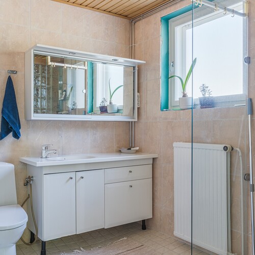 Varusteet: suihku, suihkuseinä, kiinteät valaisimet, peilikaappi, allaskaappi, kylpyhuonekaapistot, lattialämmitys