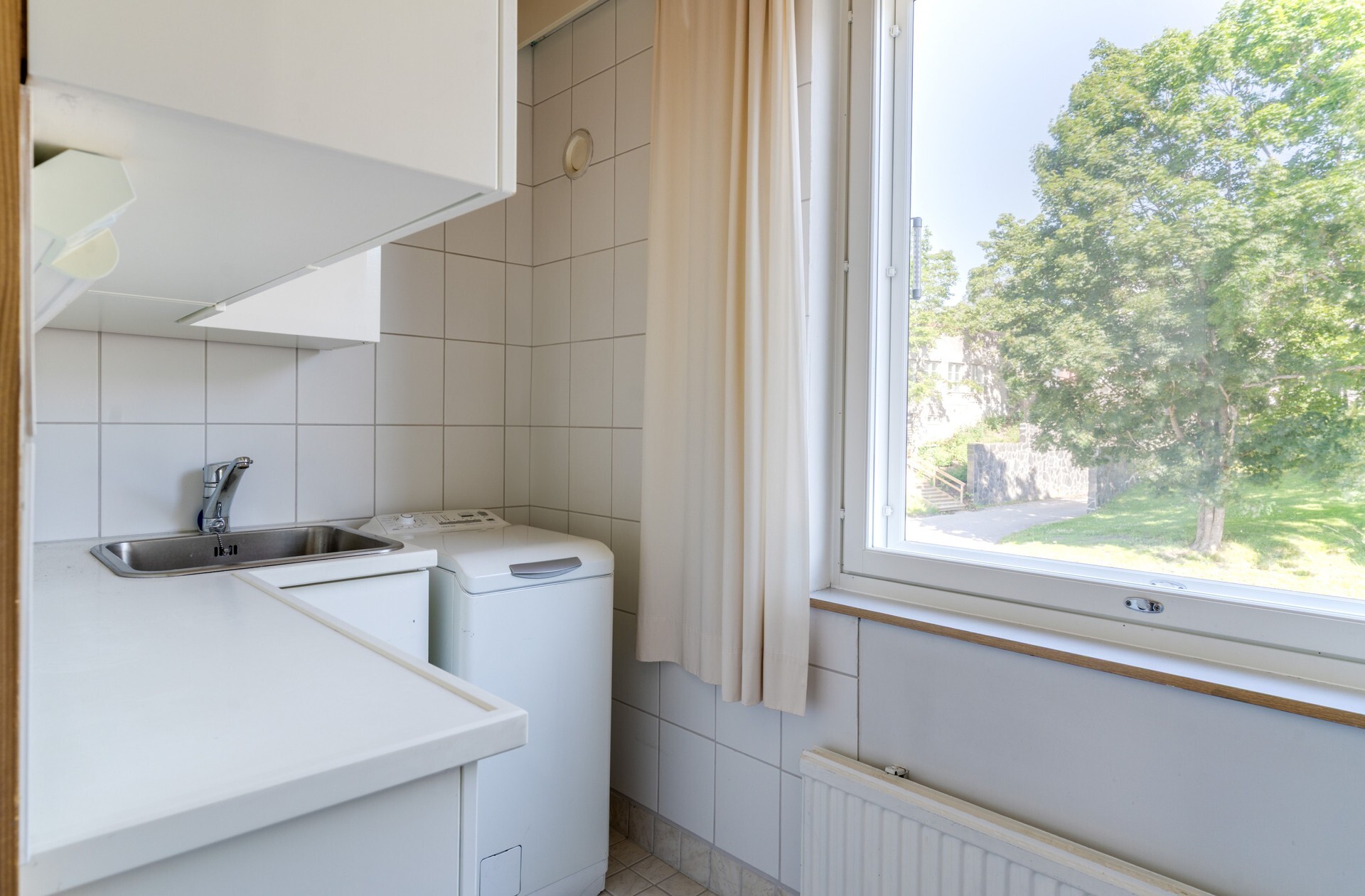 Kodinhoitohuoneessa todella paljon kaappitilaa ja iso ikkuna.