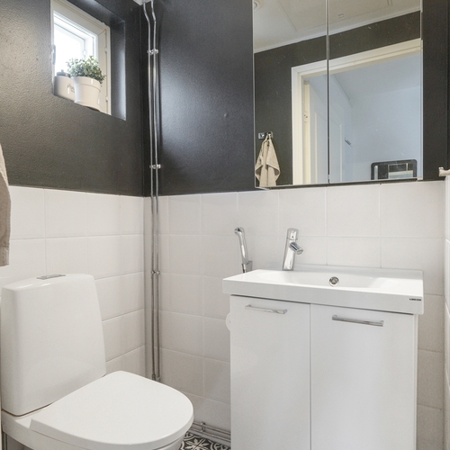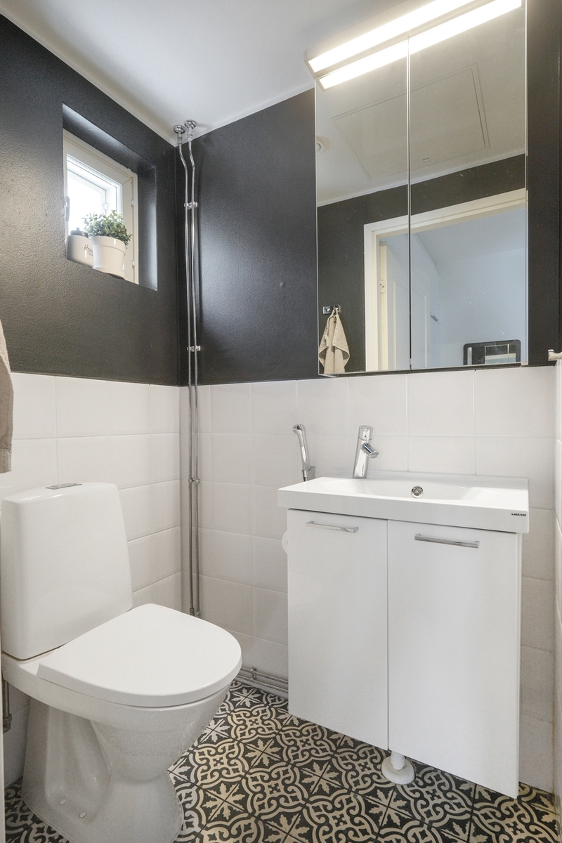 Varusteet: lattiaan asennettu WC, bidee, peilikaappi