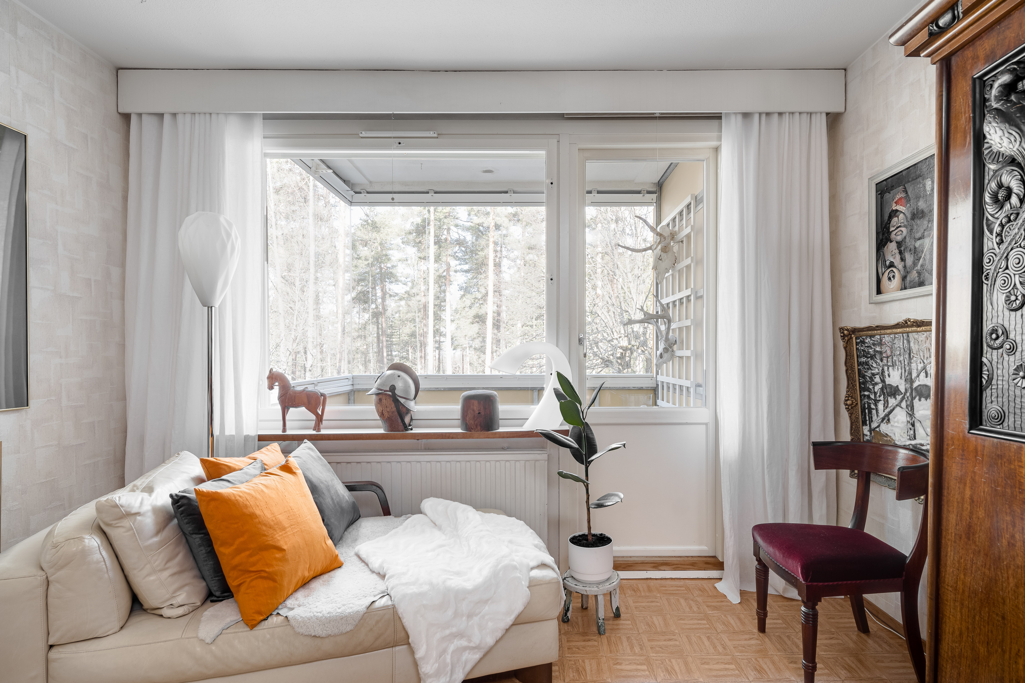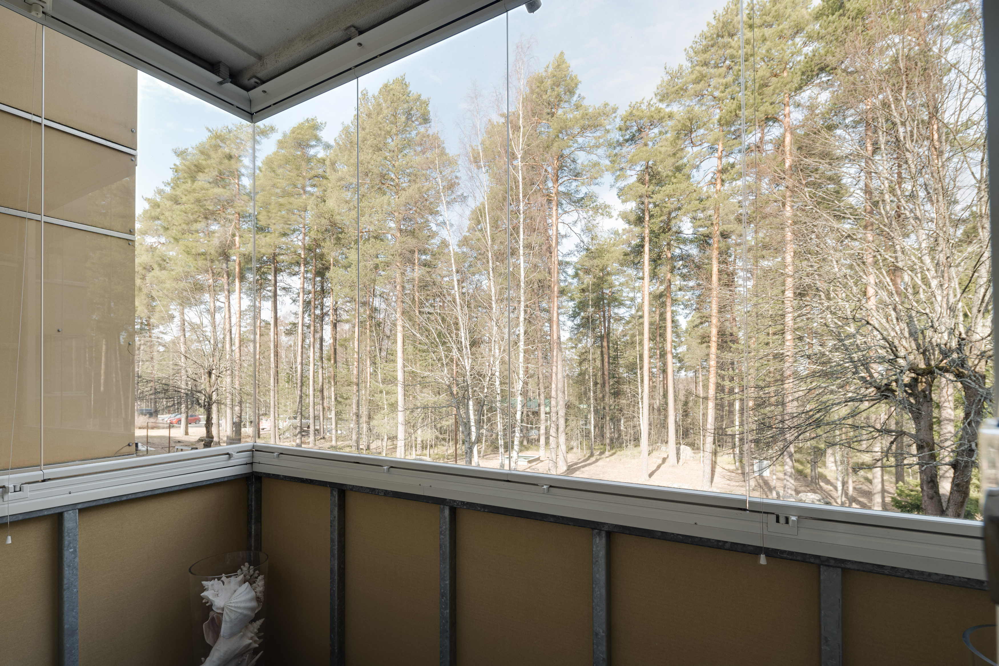 – olohuoneesta käynti lasitetulle parvekkeelle, josta voit ihailla harjumaisemia