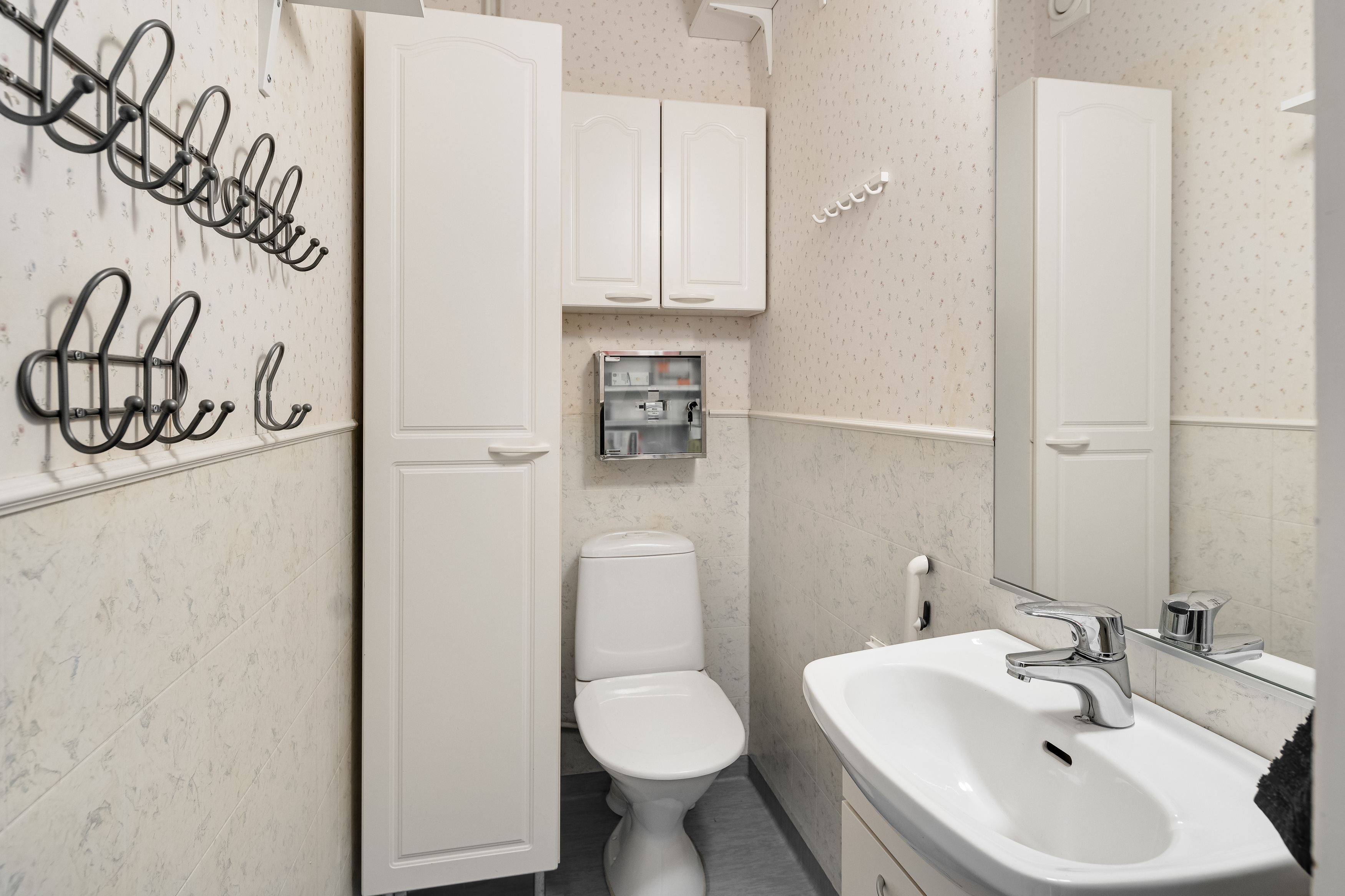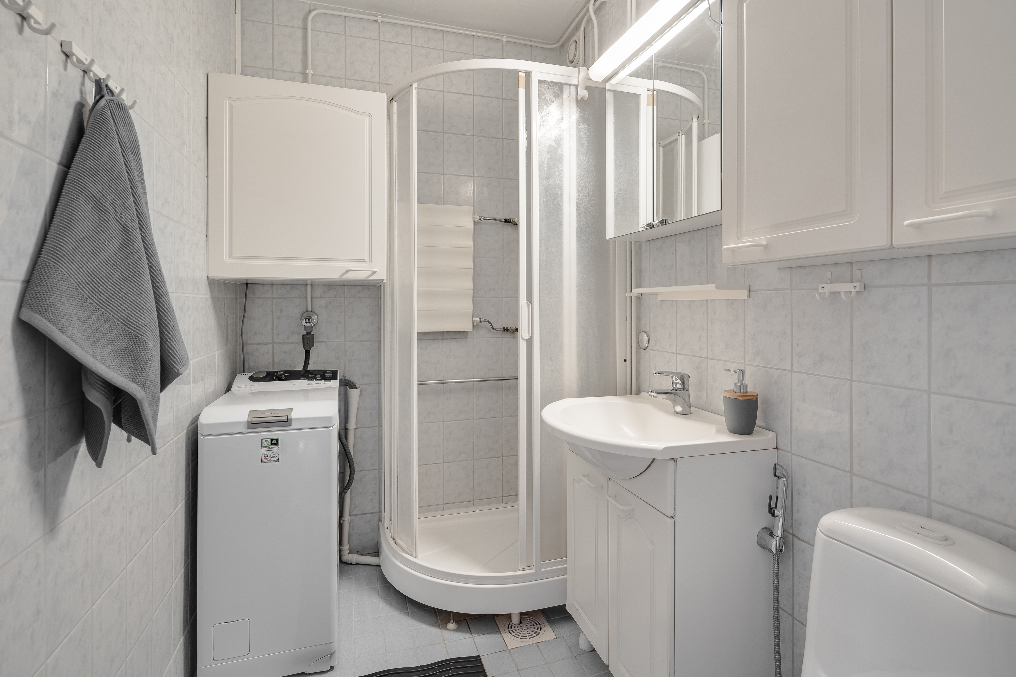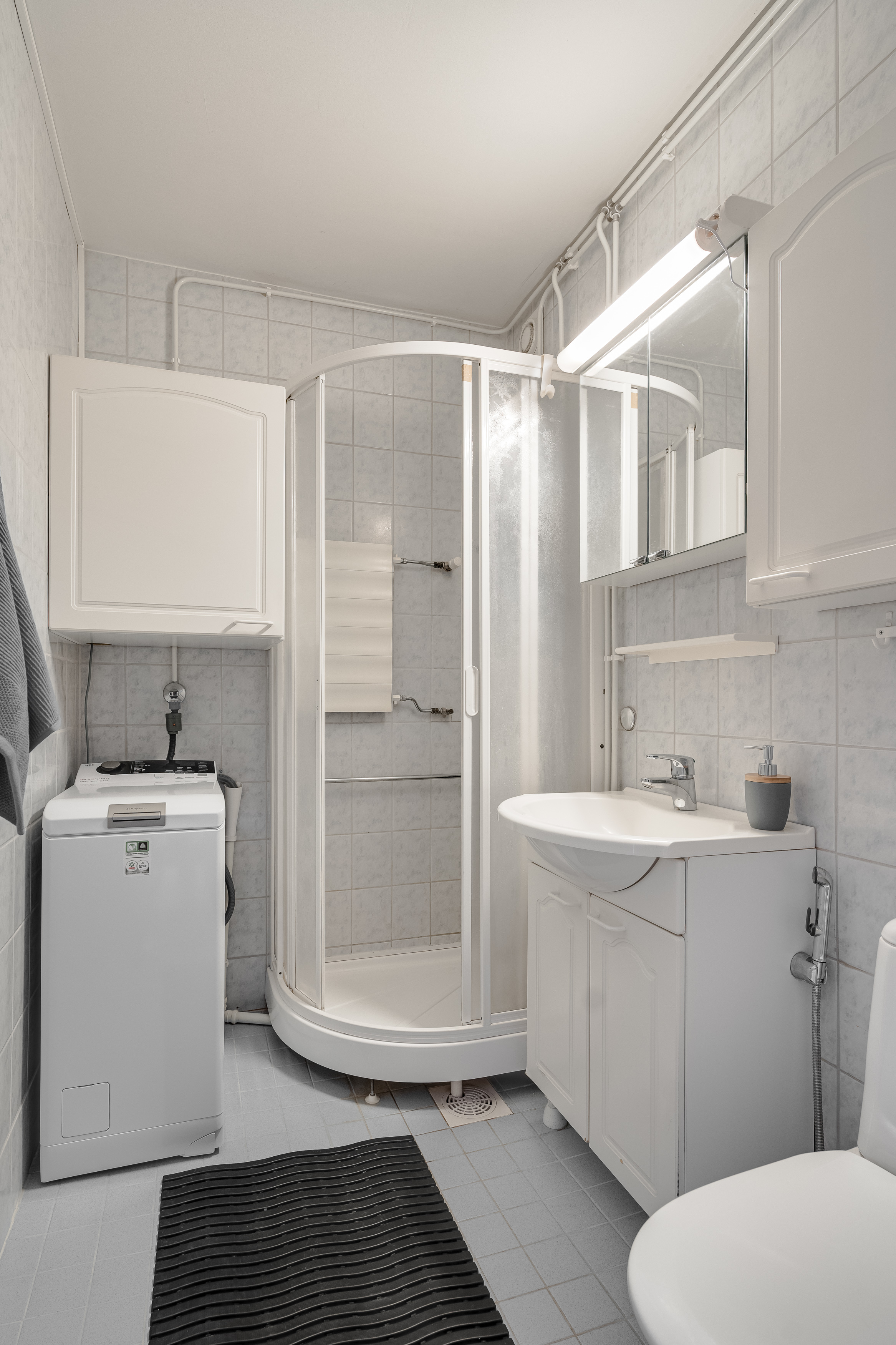 Varusteet: suihkukaappi, pesukoneliitäntä, suihku, peilikaappi, kiinteät valaisimet, kylpyhuonekaapistot