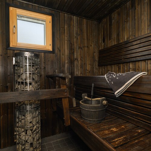 Varusteet: sähkökiuas, lattialämmitys, ikkuna ulos