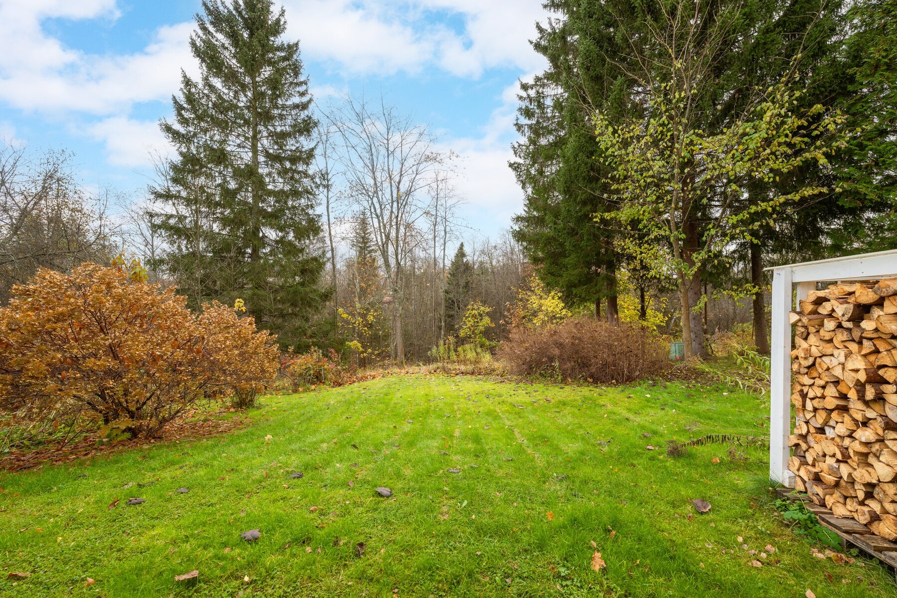 Etelän suuntaan oleva nurmipiha ja terassialue. Yhtiön tontti rajoittuu piha-alueen puolelta Jokiäyräänpuistoalueeseen.