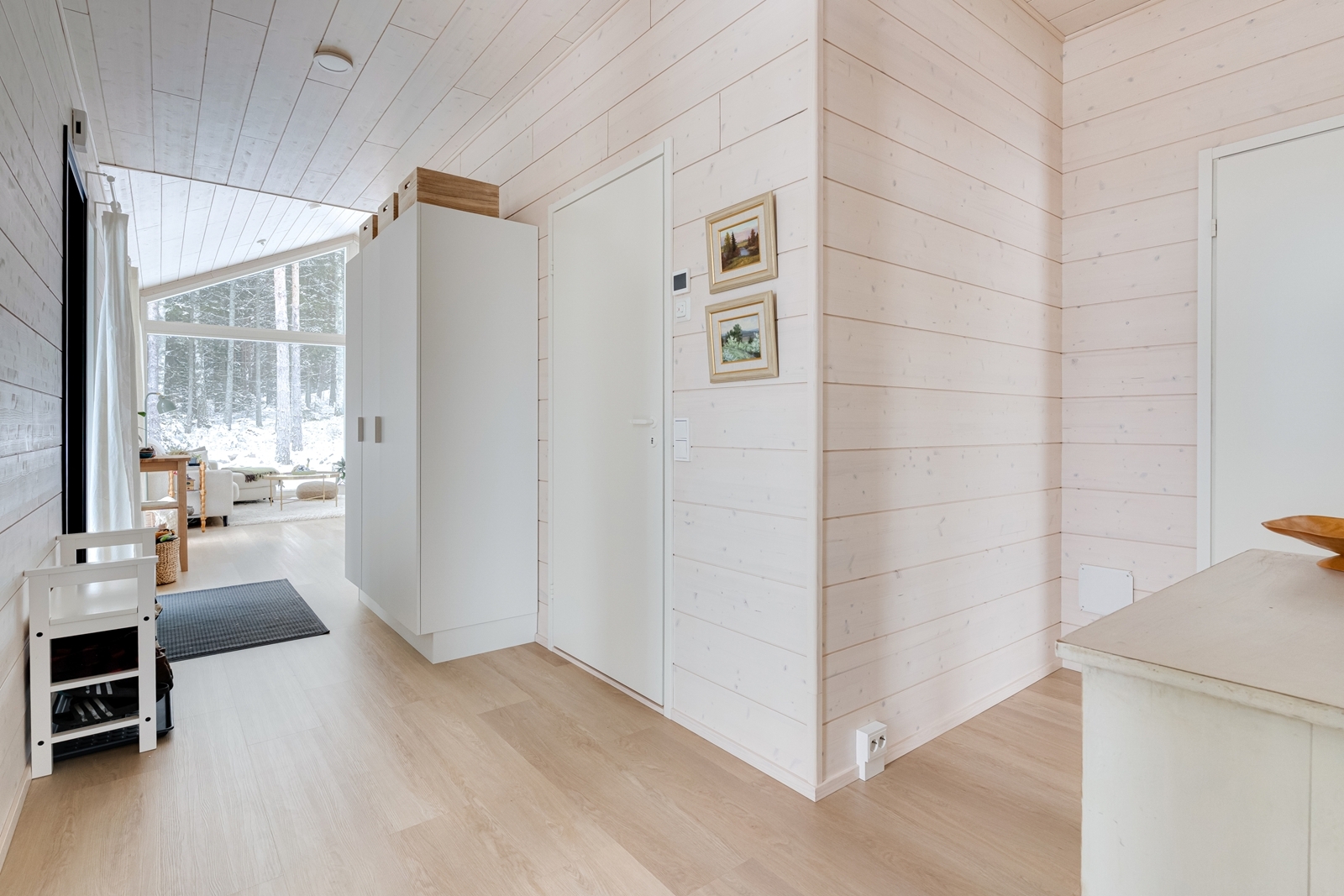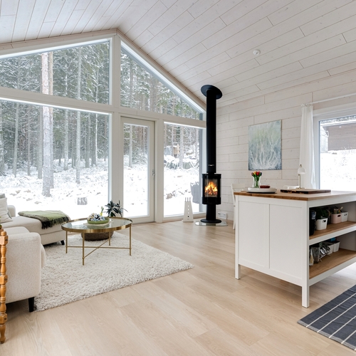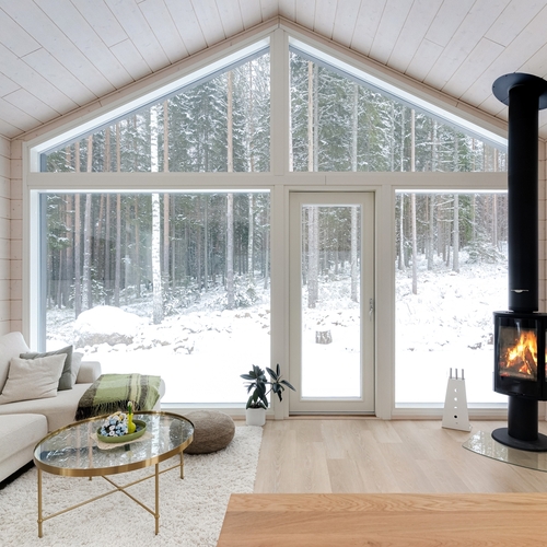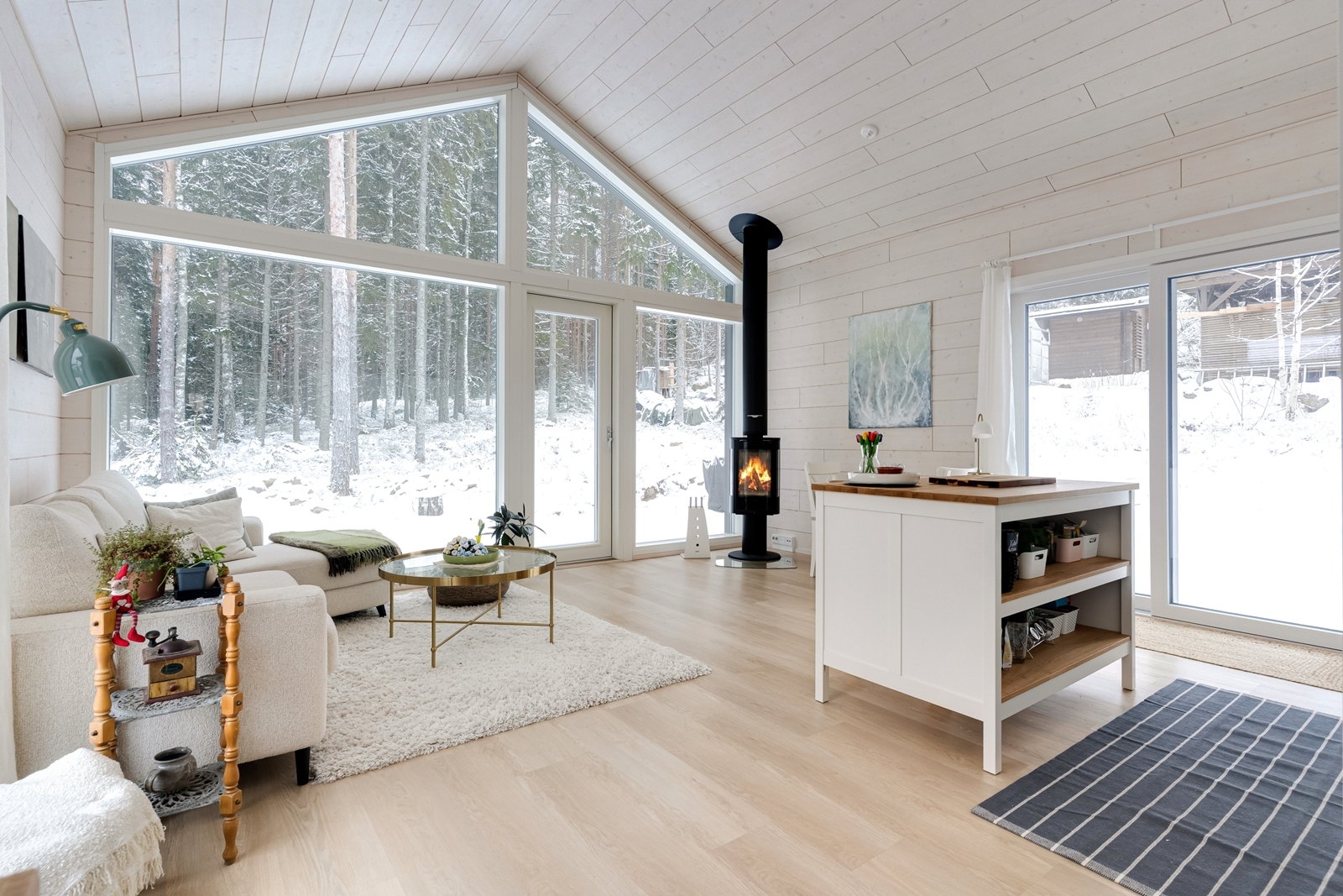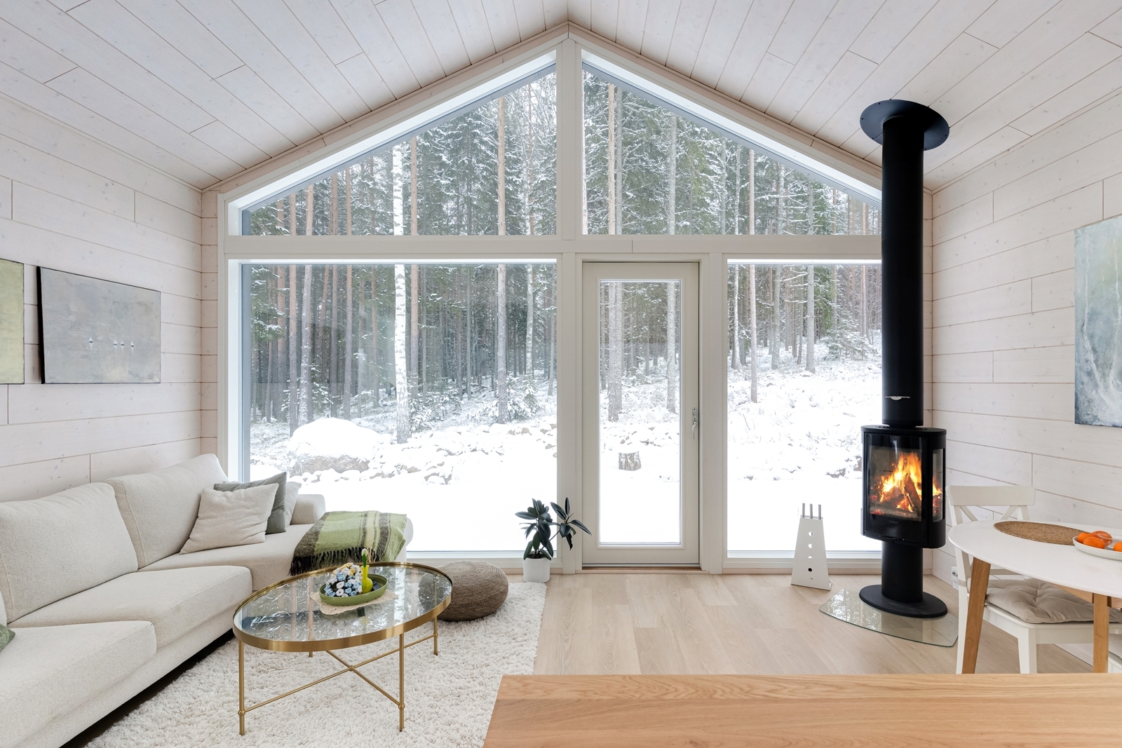 -Oleskelutilojen pääty lähes kokonaan ikkunapintaa – upeat, esteettömät näkymät suoraan metsään ja hulppea 4 metrin huonekorkeus