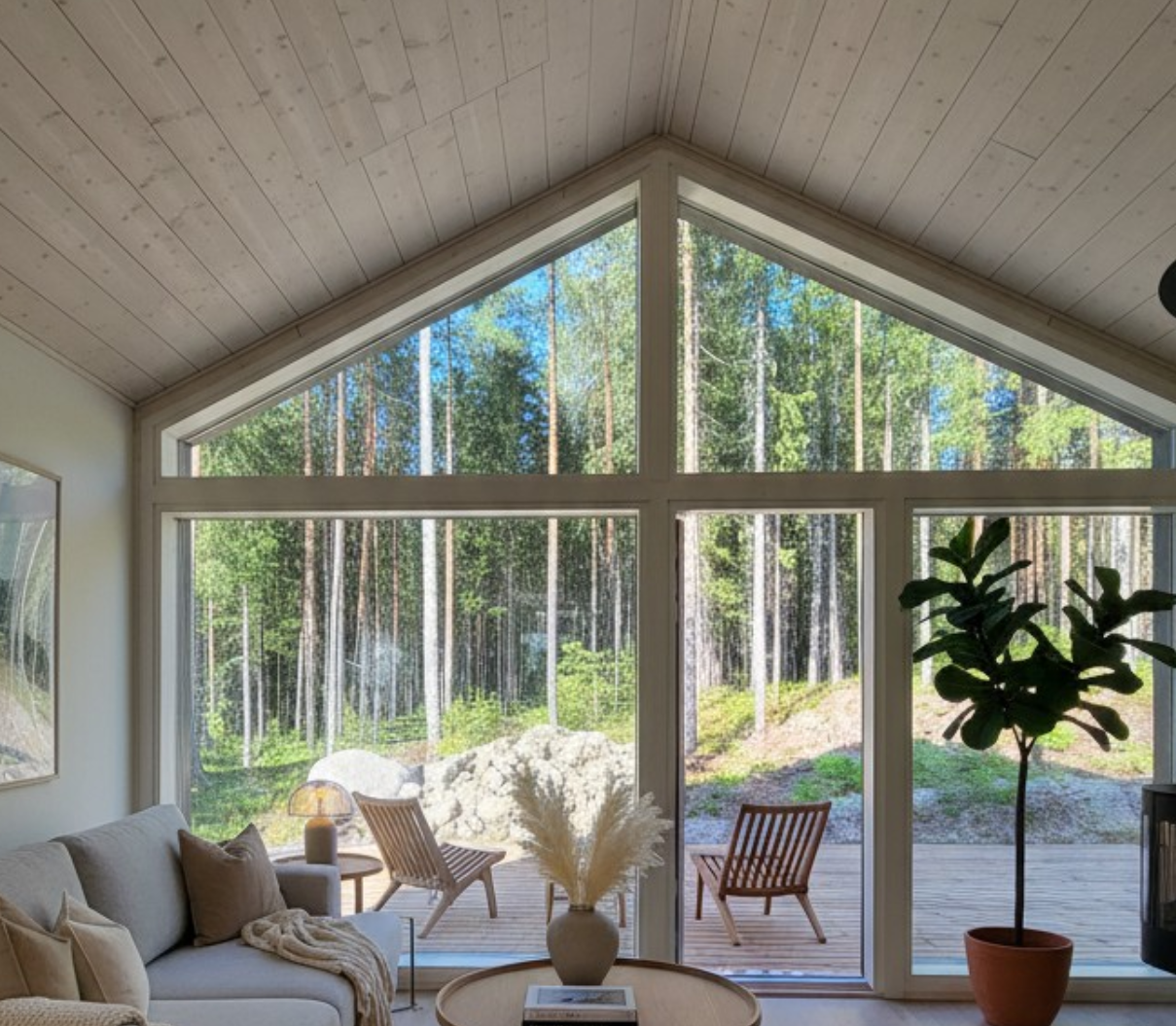 Kodin 75,50 m² tilat on suunniteltu tehokkaasti ja arkea palvelevasti. Kolme makuuhuonetta mahdollistavat joustavat ratkaisut pariskunnalle, pienelle perheelle tai etätyötilaa tarvitsevalle. Oleskelutilan lähes koko päädyn kattava ikkunapinta tuo runsaasti luonnonvaloa ja avaa näkymät suoraan metsään. Lähes neljän metrin huonekorkeus korostaa tilan avaruutta.