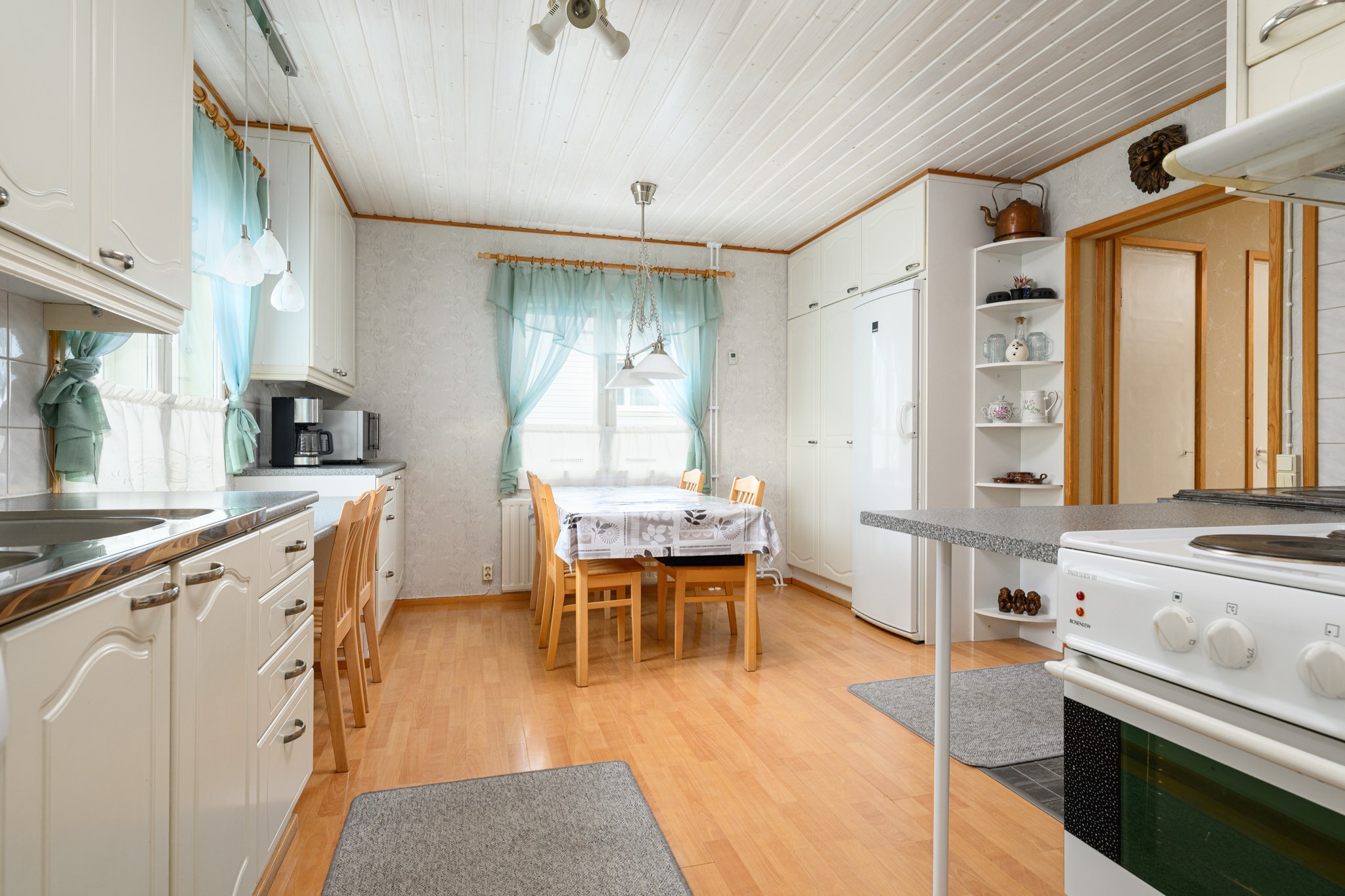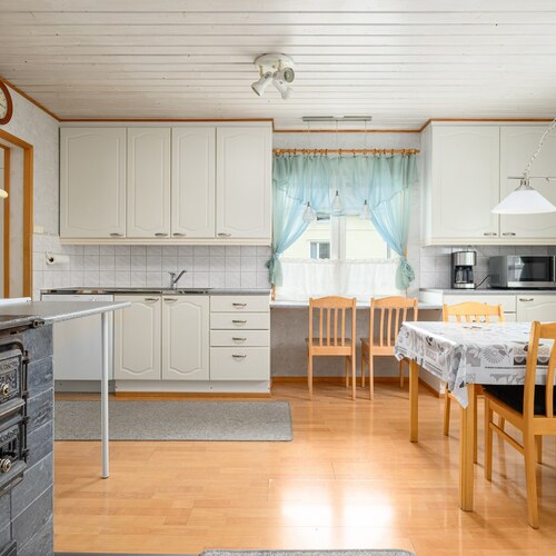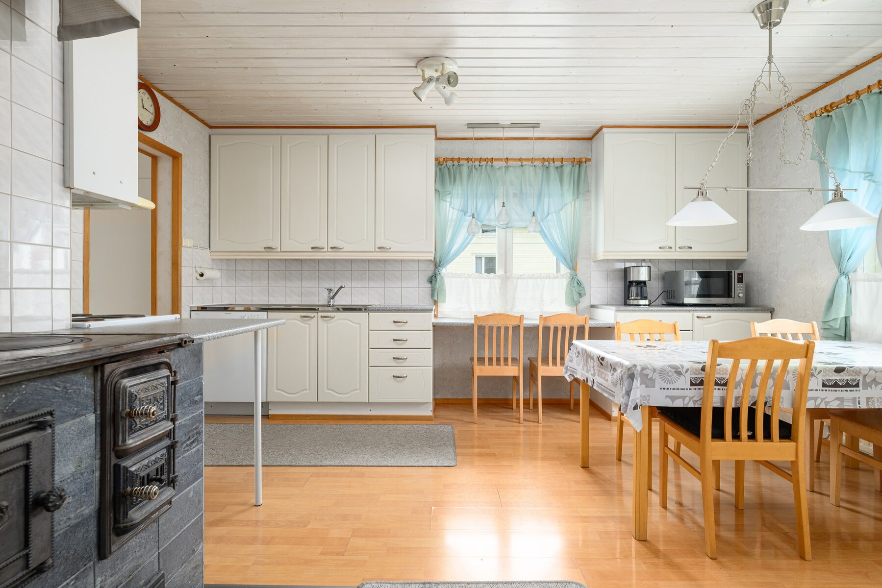 – Tilava keittiö, johon perinteinen puuhella tuo lämpöä ja tunnelmaa