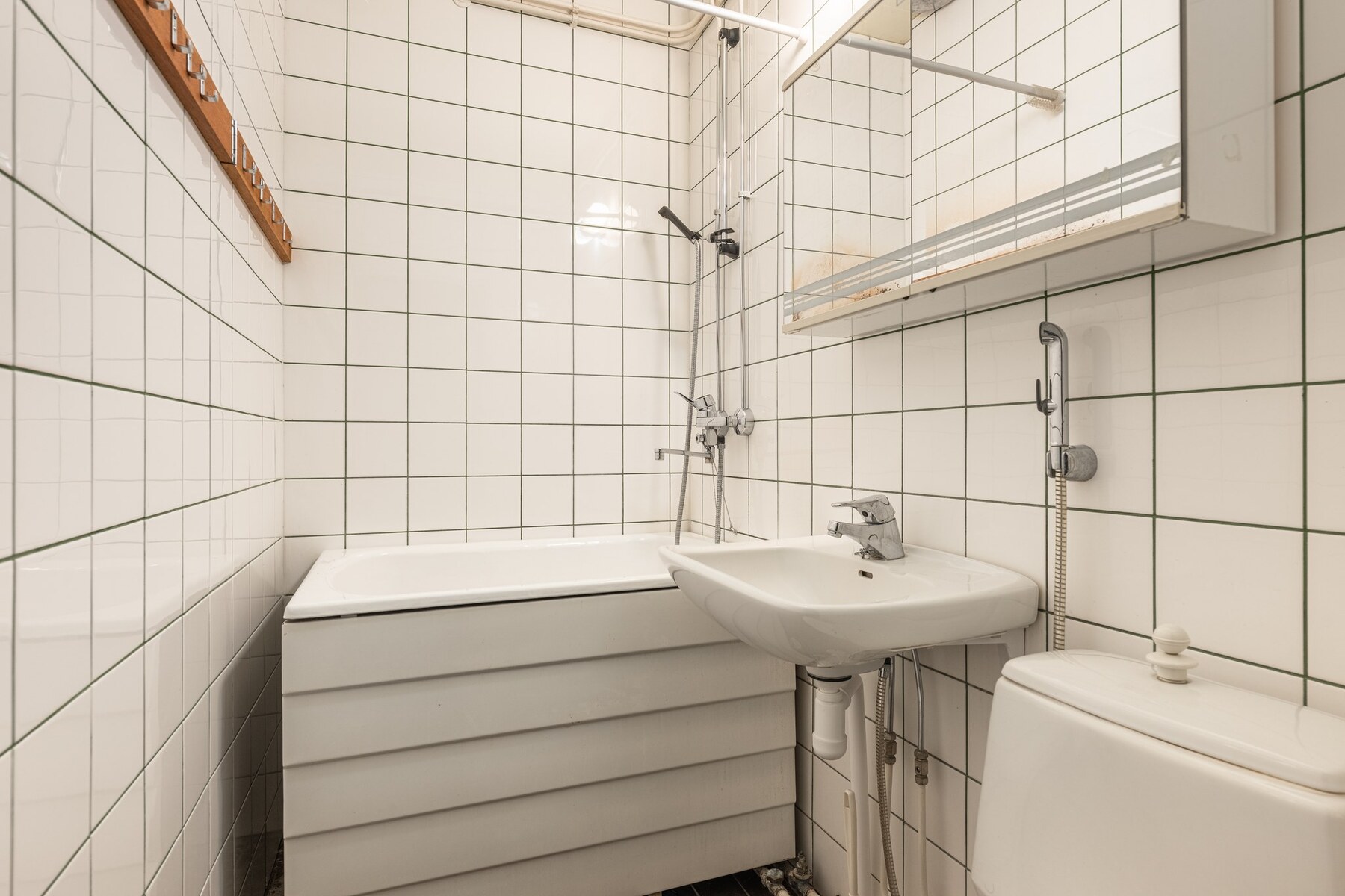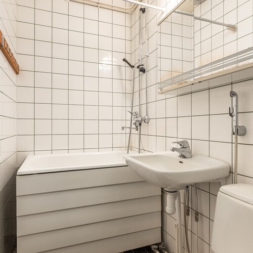 Varusteet: suihku, peilikaappi, kylpyamme