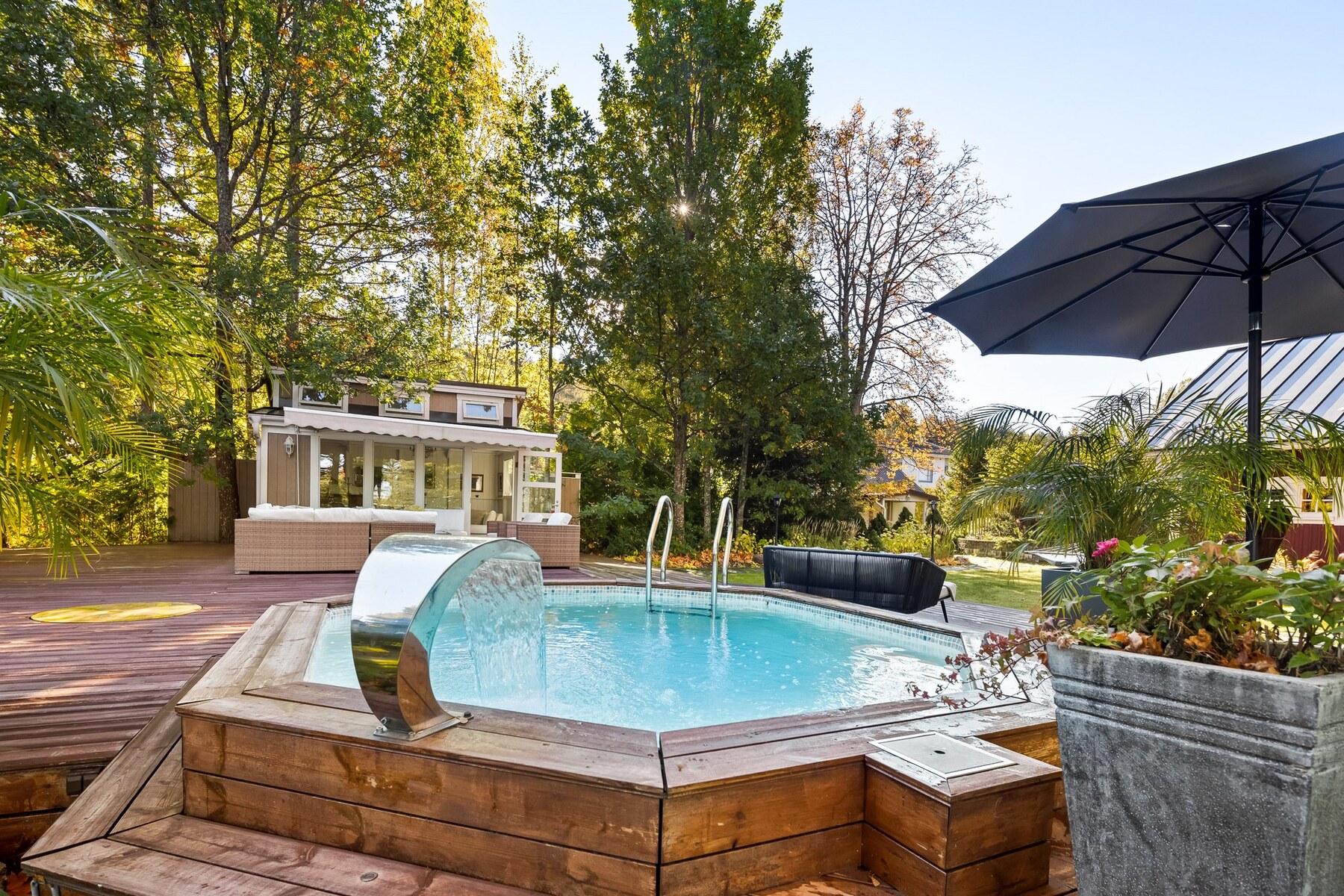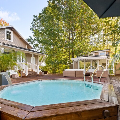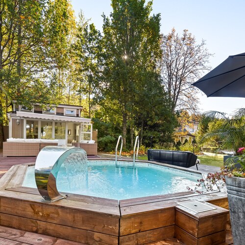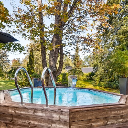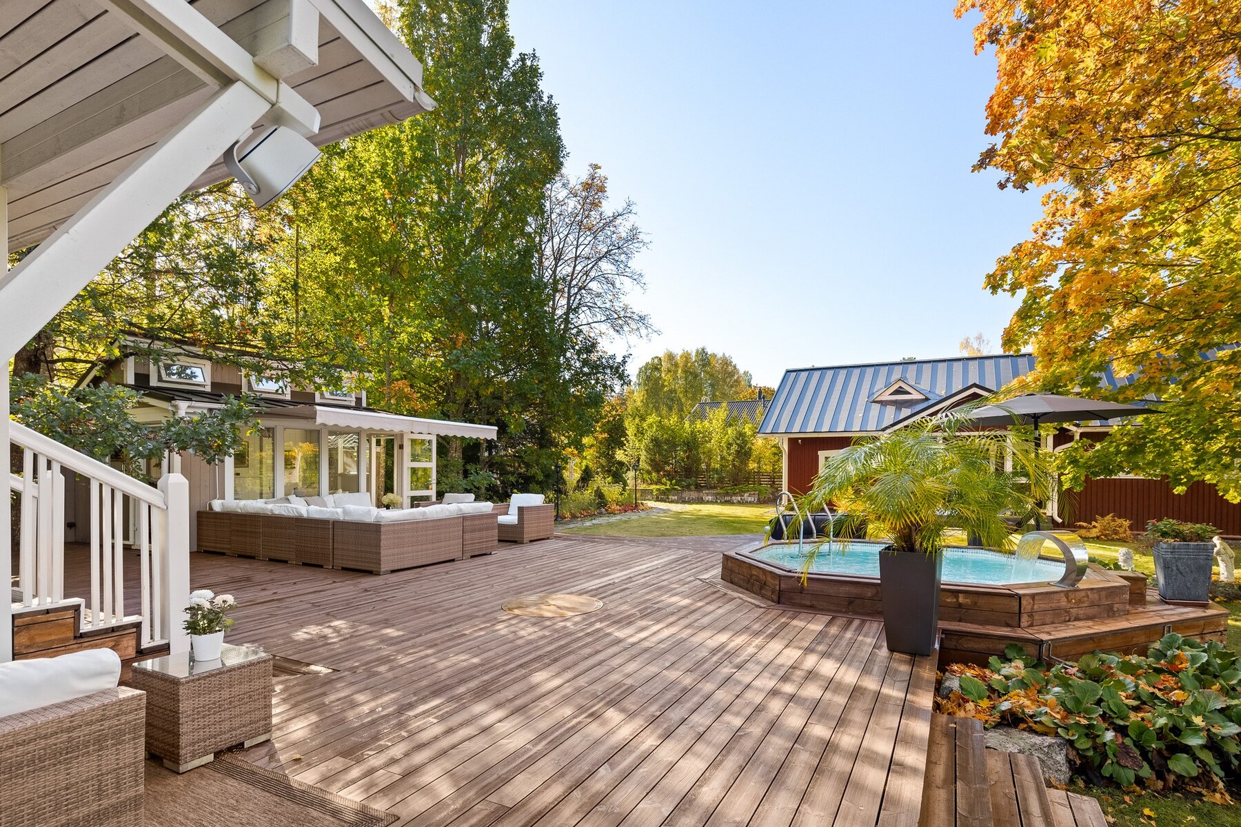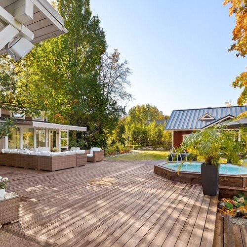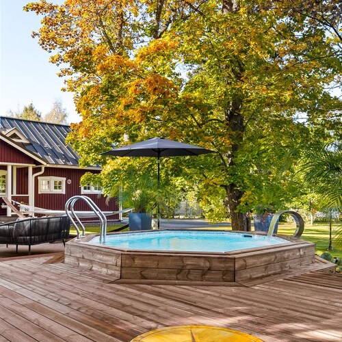 Hulppea terassi, johon upotettu lämmitettävä uima-allas.