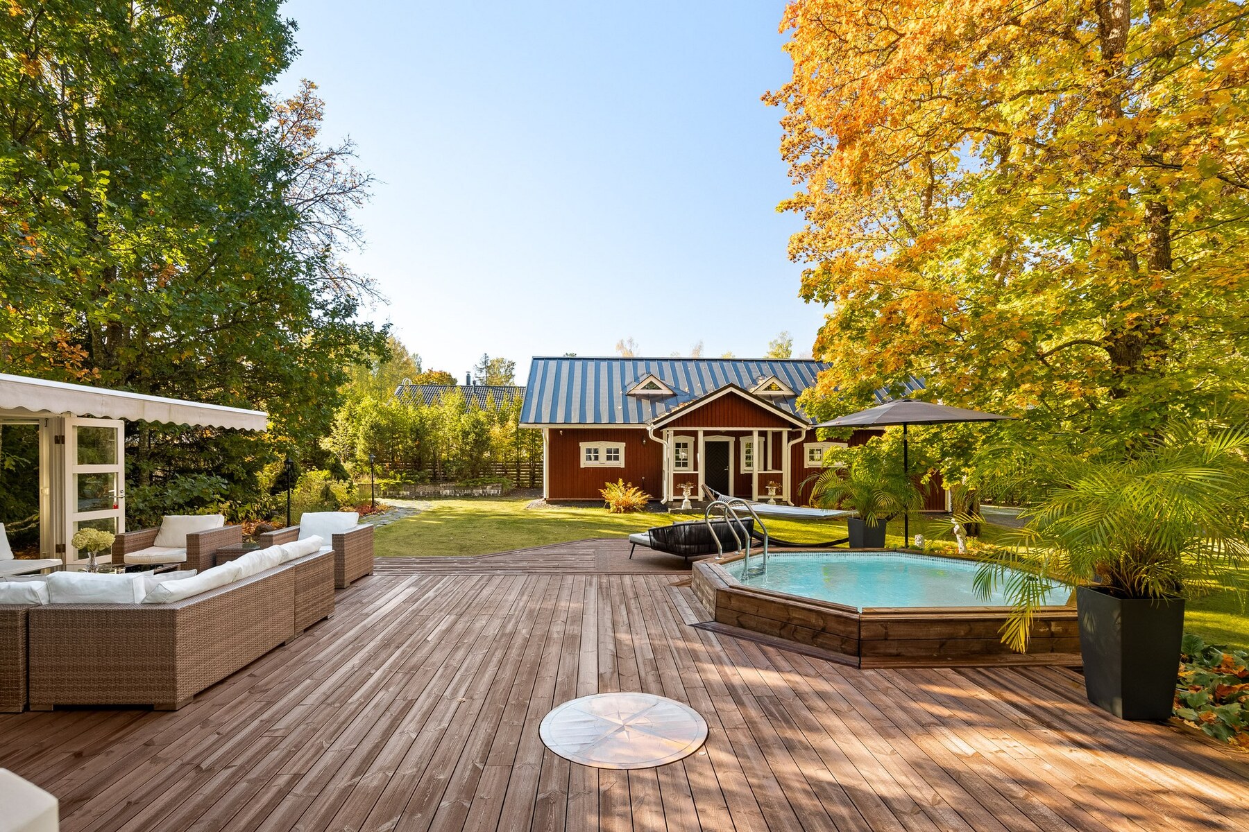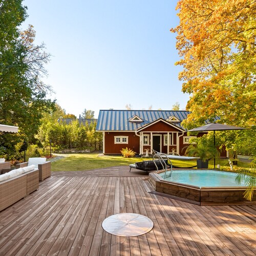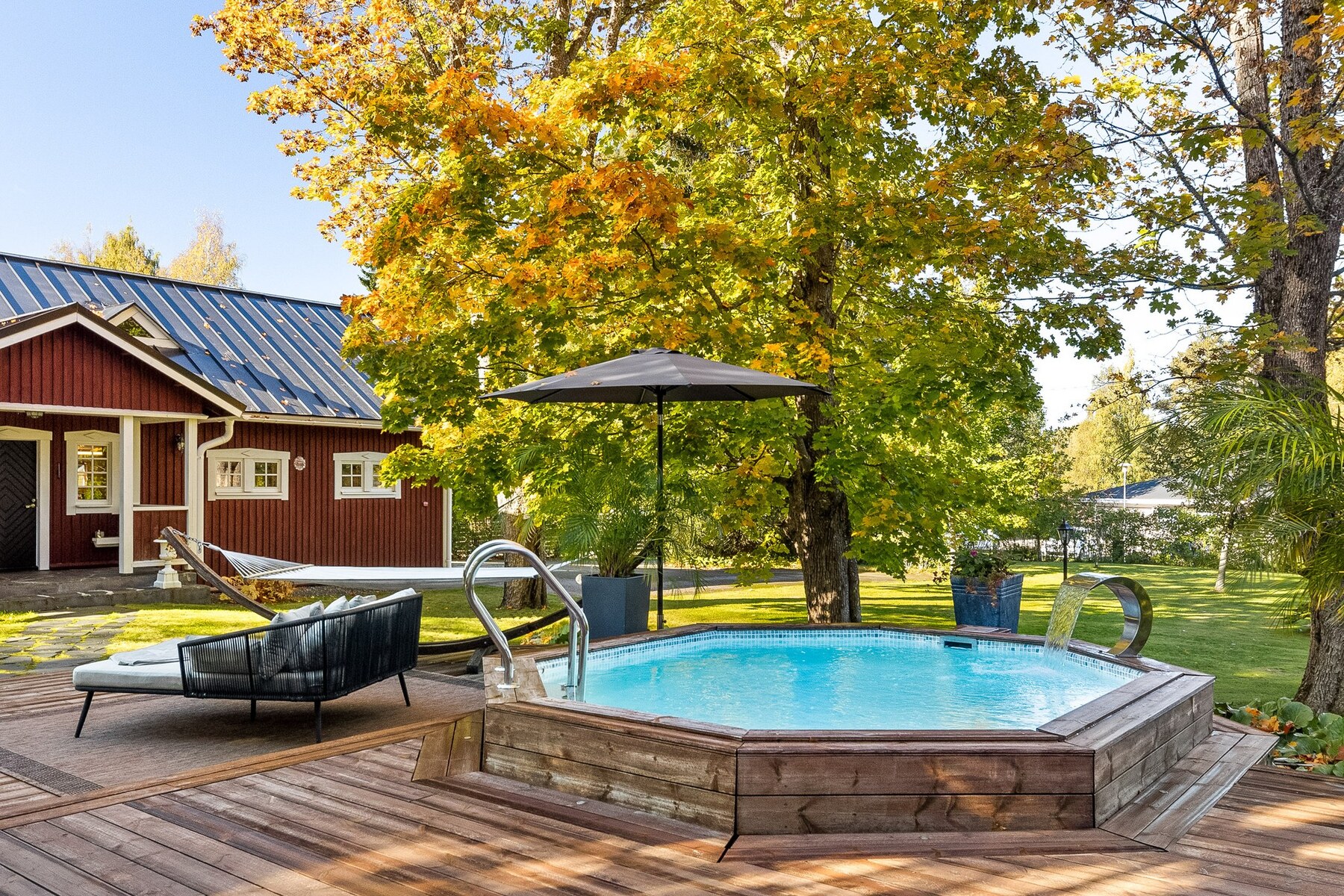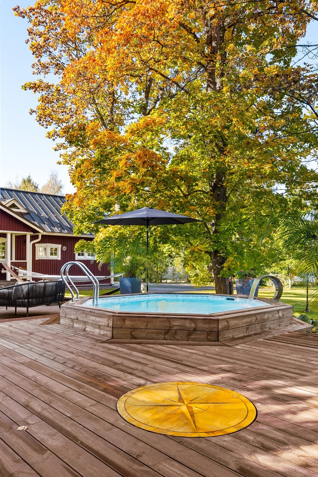 – Kaunis pihatalo 16 m², jonka edessä 300 m² terassialue upotettuine uima-altaineen on rakennettu v. 2013.