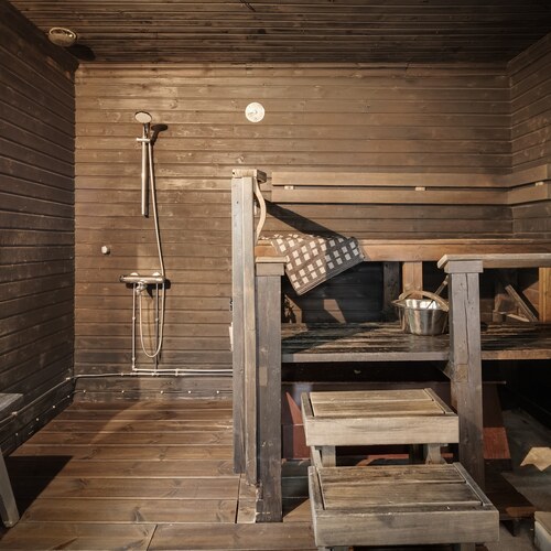 Ulkosauna puulämmitteinen, lämminvesivaraaja, takkatupa, jossa kevyttakka.