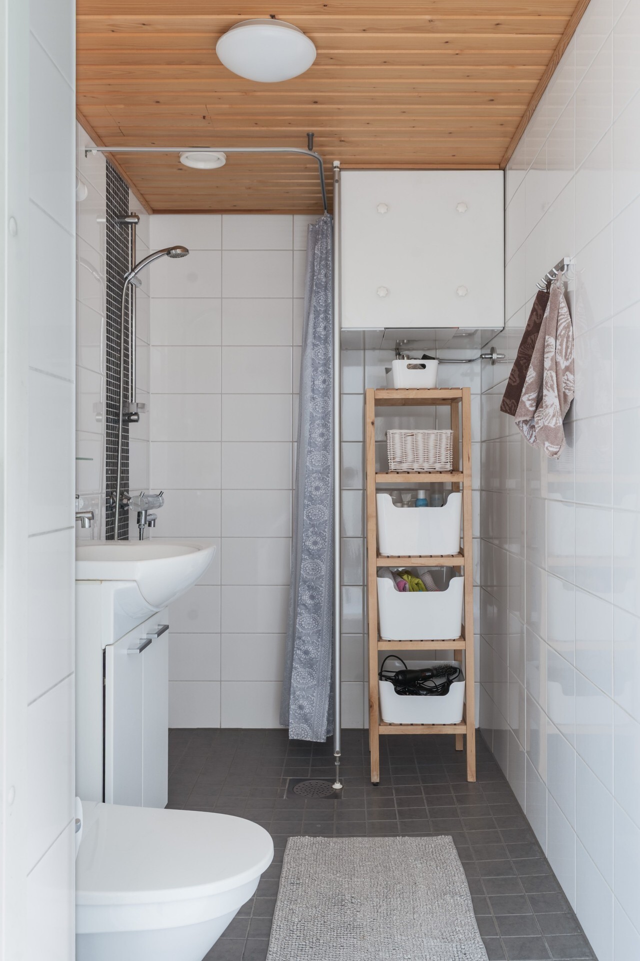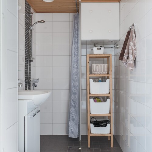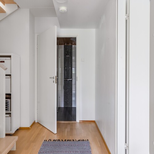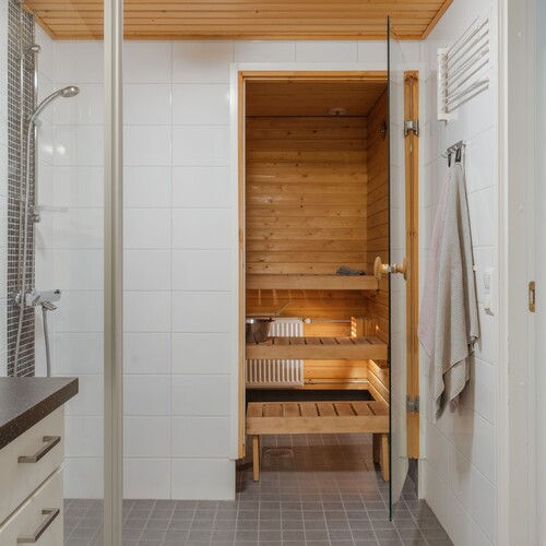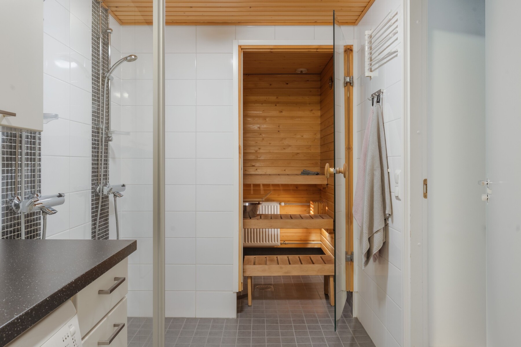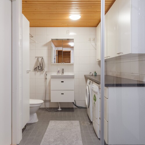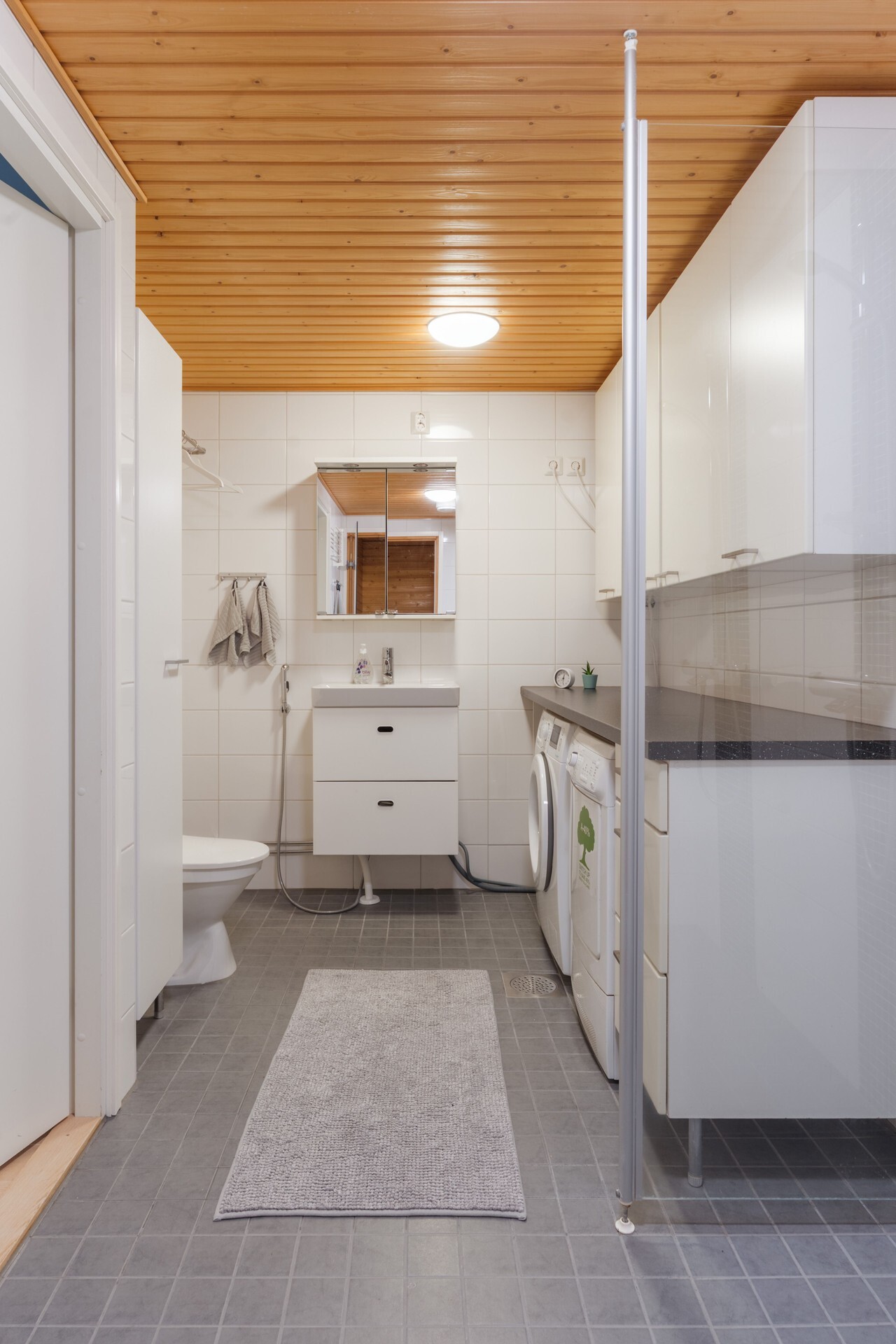 Alakerta: Suihku x 2, sauna, allaskaappi, peilikaappi, kodinhoitohuoneen kaapistot, integroitu silityslauta, pesukoneliitäntä, pyykkikaappi, lattialämmitys, kiinteät valaisimet, oskarinoksa, pyykinkuivatusrekki