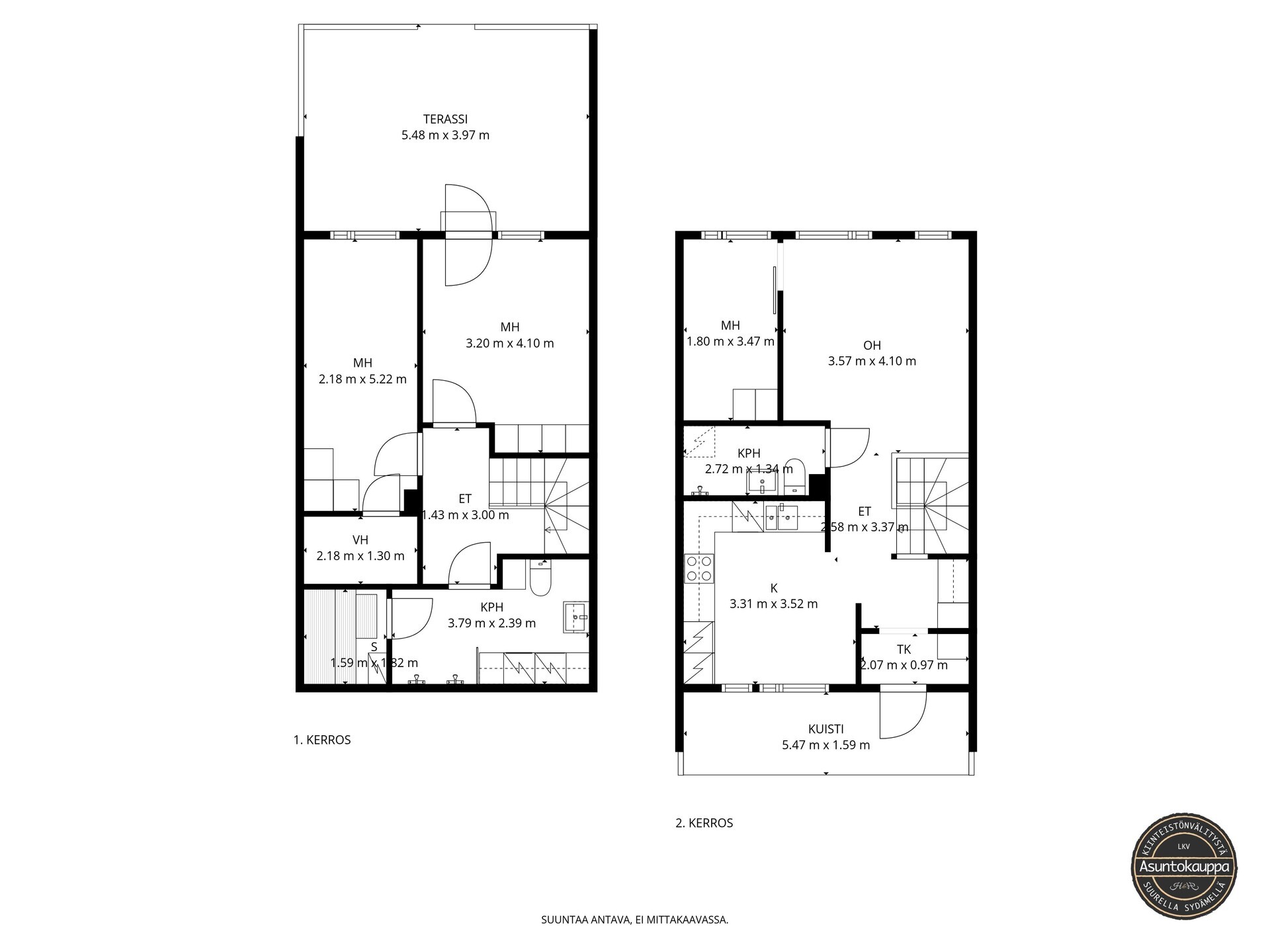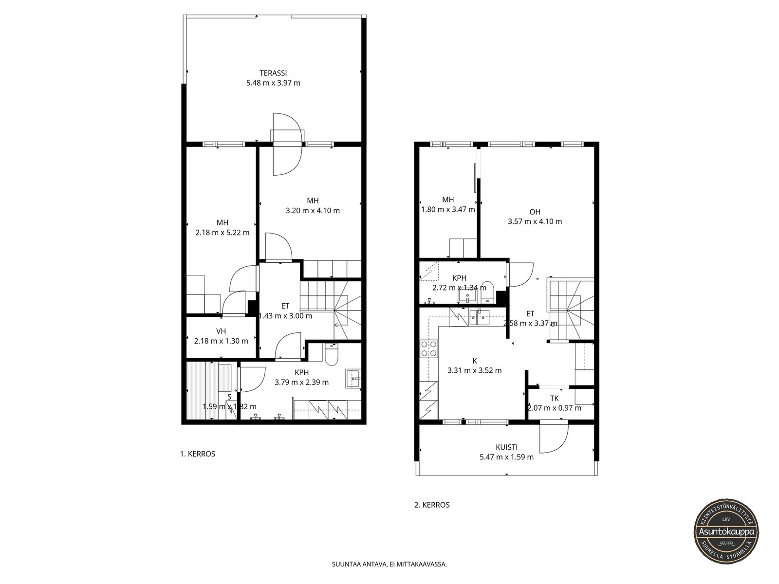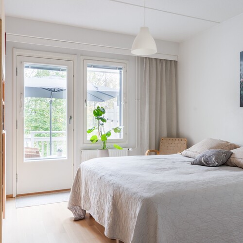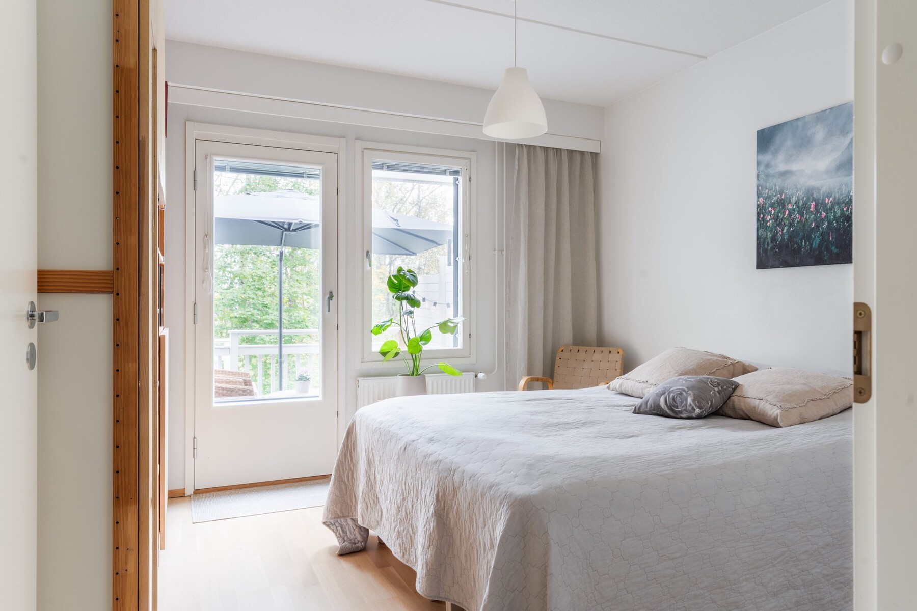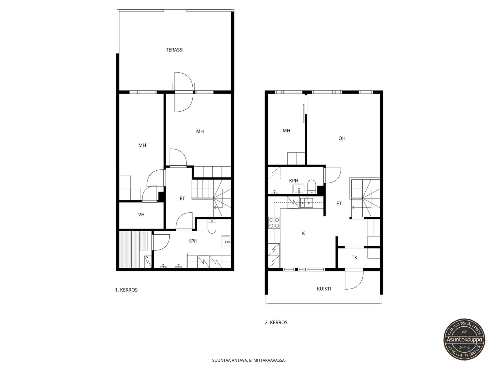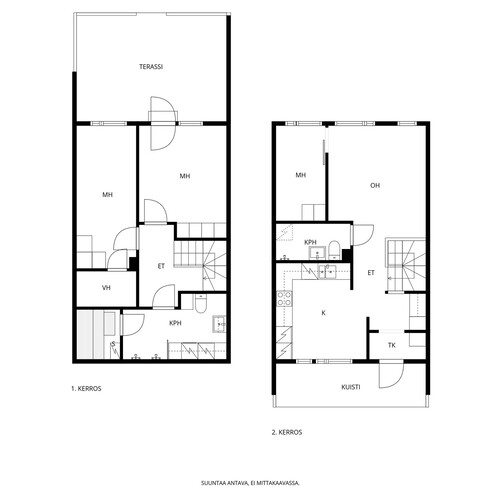 -Kaksikerroksinen pohjaratkaisu: makuuhuone ja kylpyhuone molemmissa kerroksissa