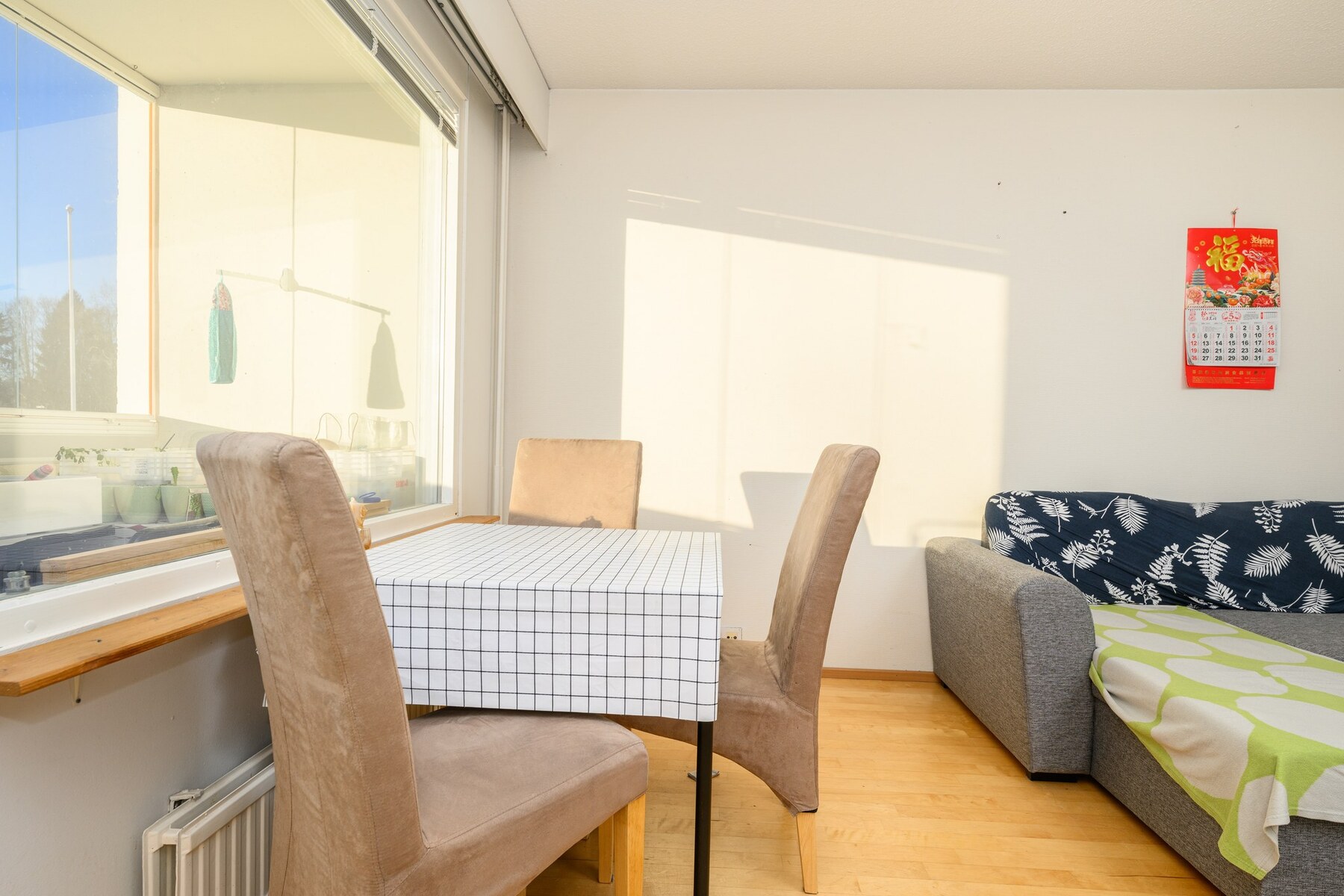– olohuone, josta käynti lasitetulle parvekkeelle