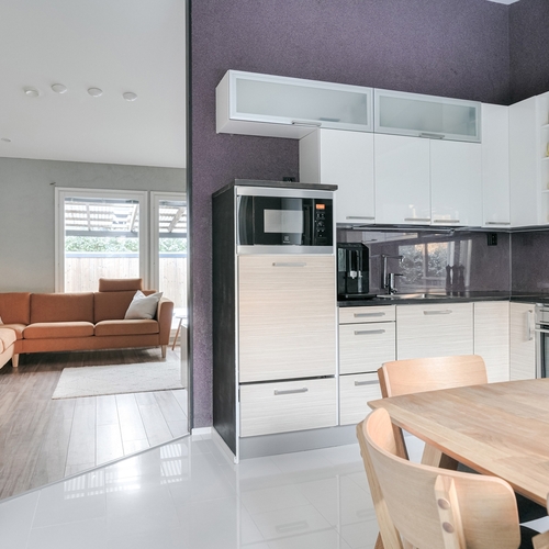 – Tilava keittiö, jossa mm. puutasot ja jääpalakoneella varustettu pakastin.