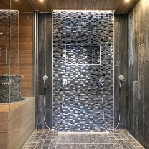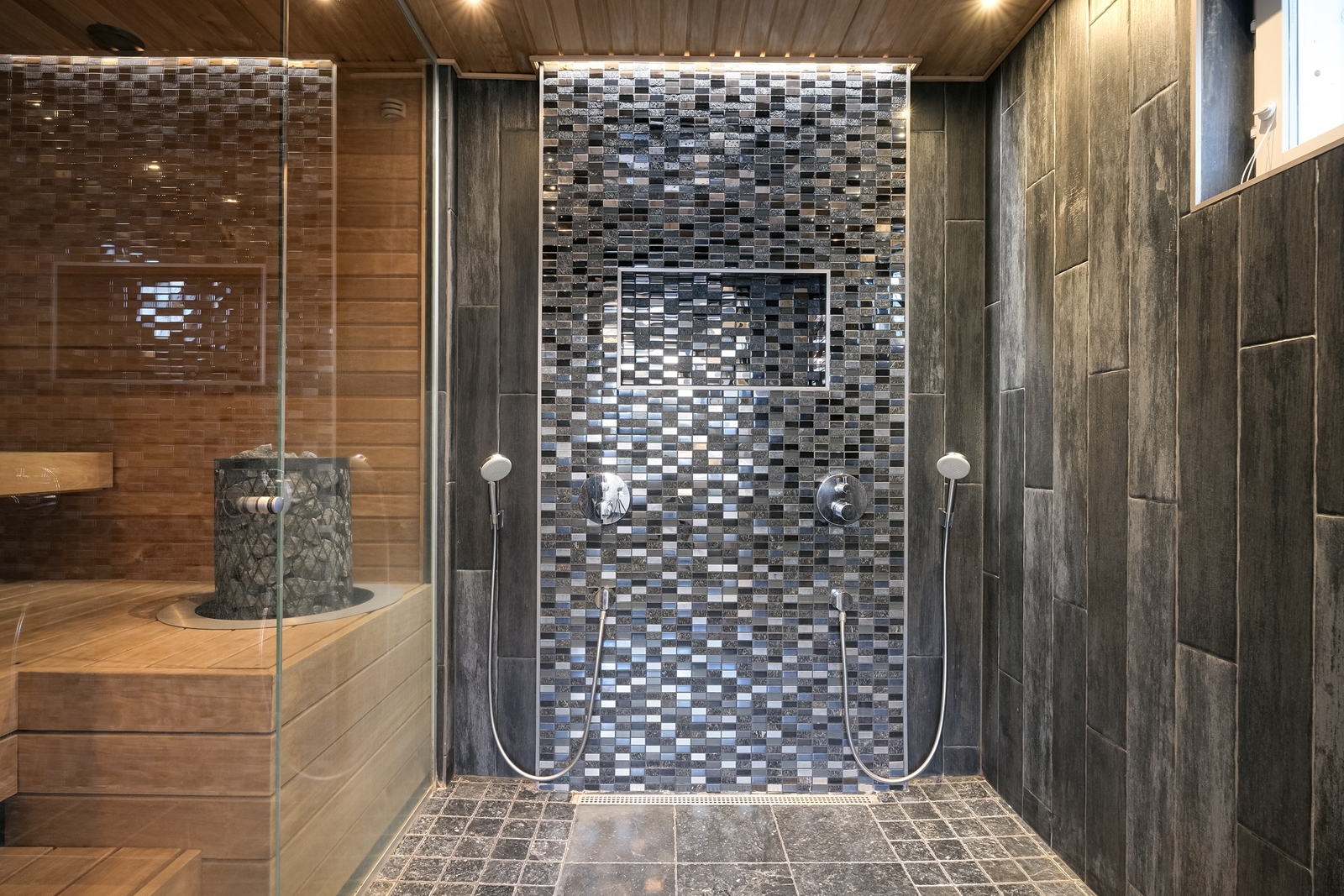 Tunnelmallinen saunaosasto, jossa hieno valaistus ja mm. kaiuttimet musiikin kuunteluun.