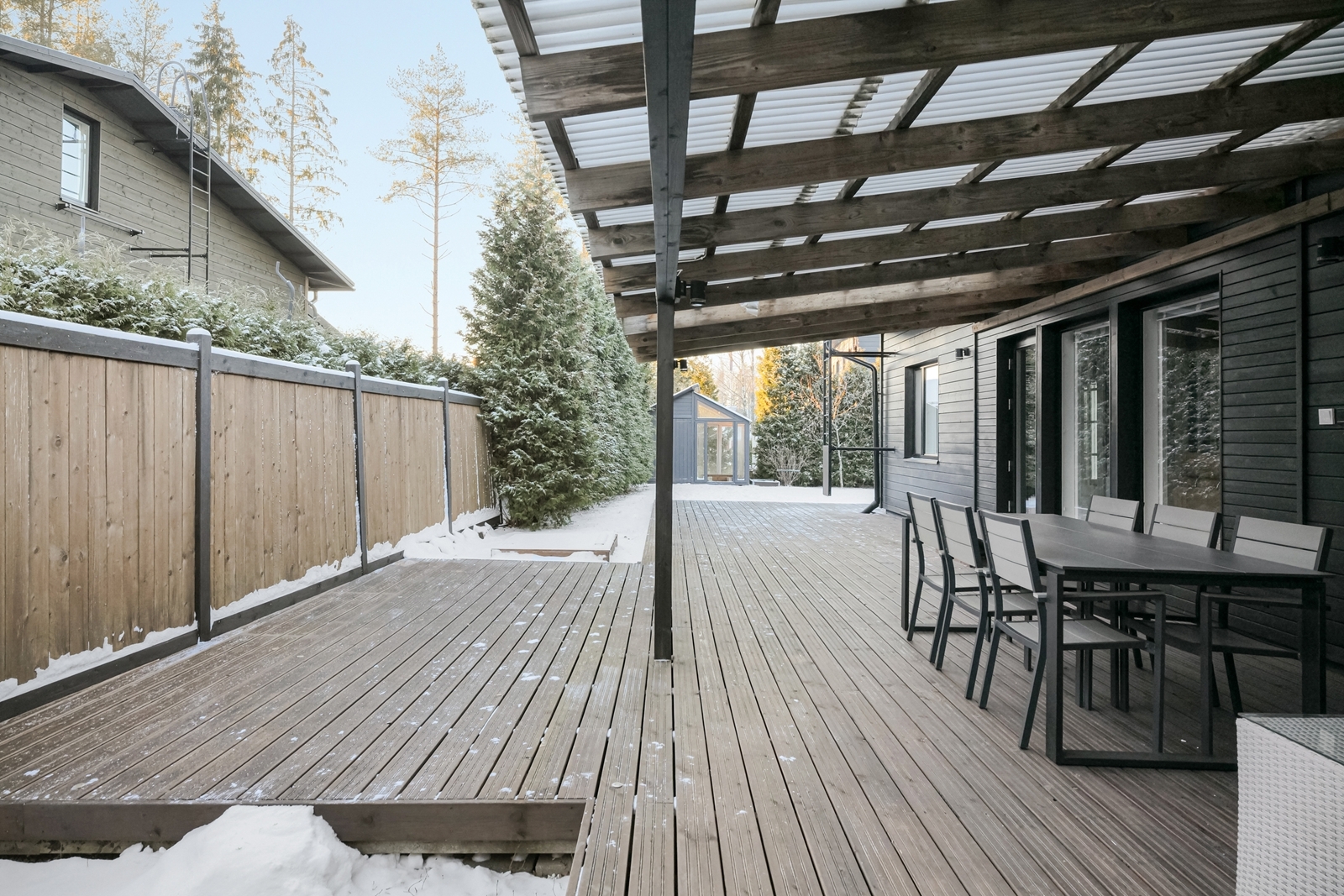 – Iso suojaisa piha-alue, josta löytyy hulppea taloa kiertävä terassi sekä kasvihuone/varasto.