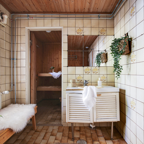 Kylpyhuone on alkuperäinen. Pesuallas.