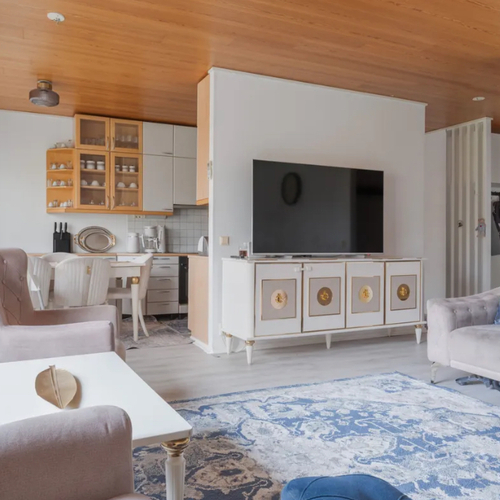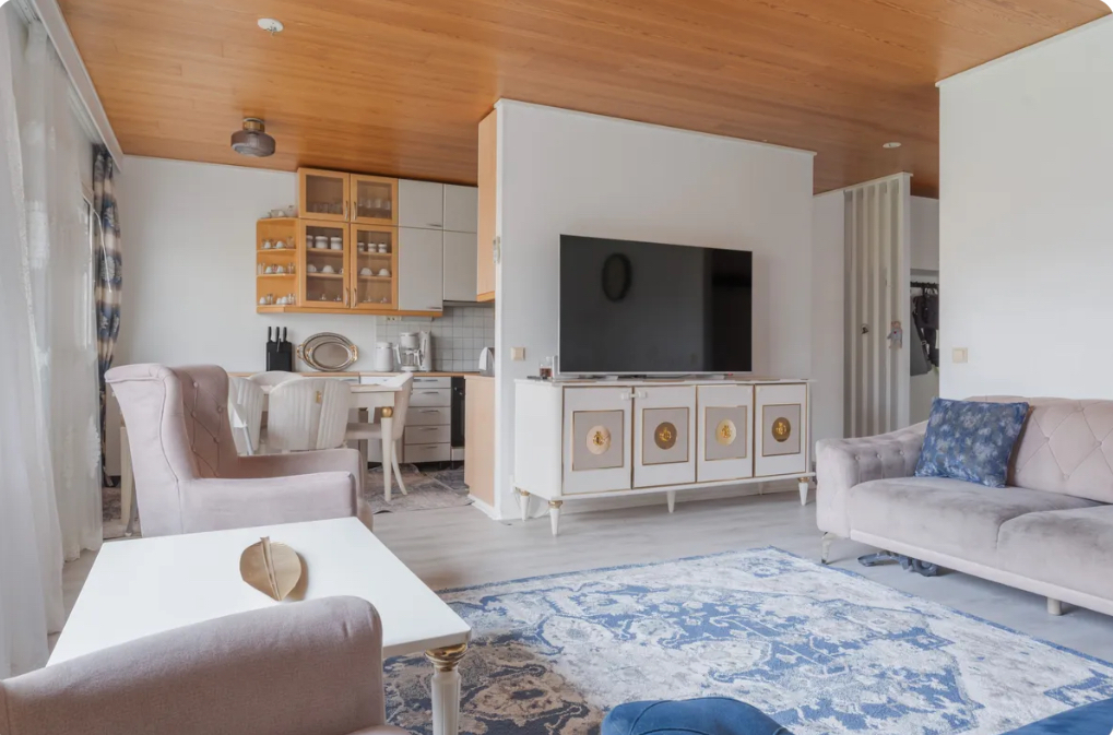 -Hyvän kokoinen olohuone, jossa suuret ikkunat