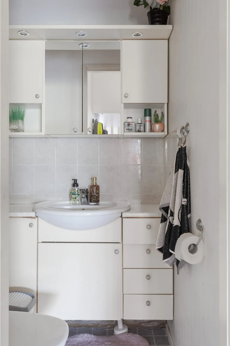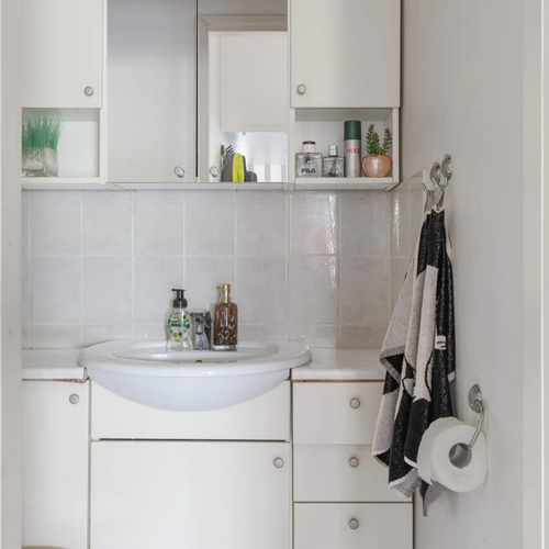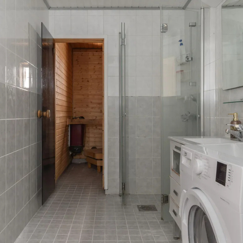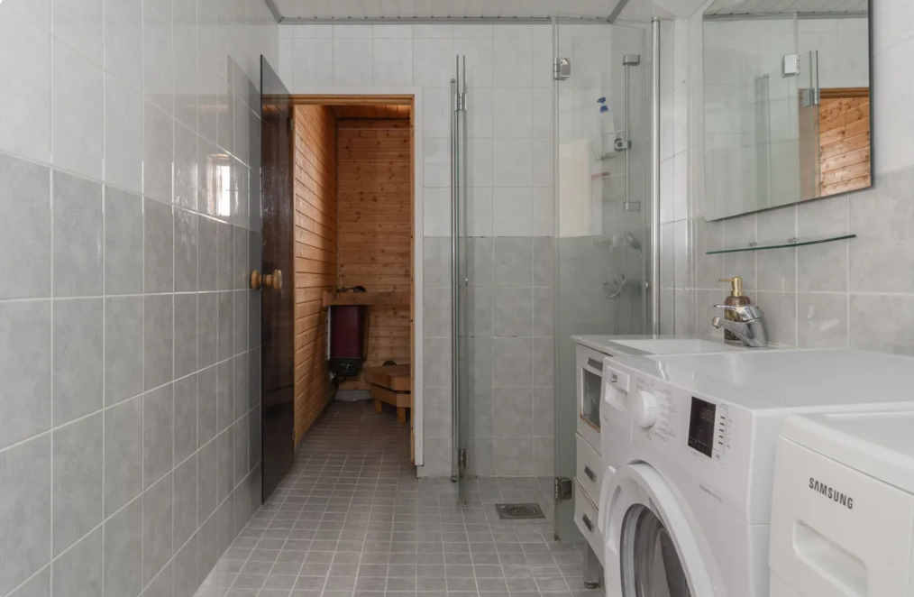 Varustus: Wc, suihku, suihkuseinä, lattialämmitys, pesukoneliitäntä, kylpyhuonekaapistot,